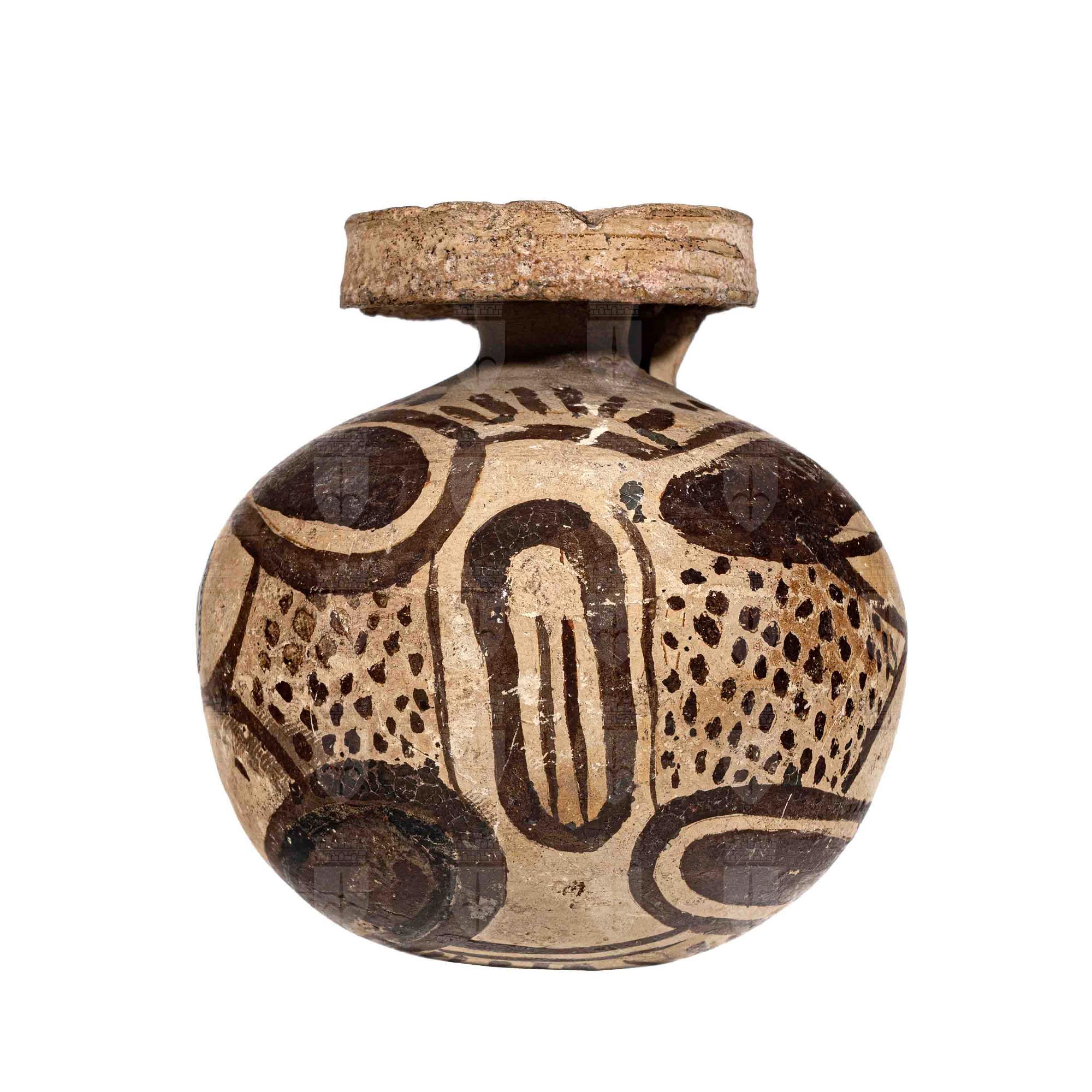 Aryballos corinzio con quattro petali contrapposti nascenti da un germoglio verticale di loto, collegati in alto e in basso da archetti sormontati da trattini, ai lati da reticoli.