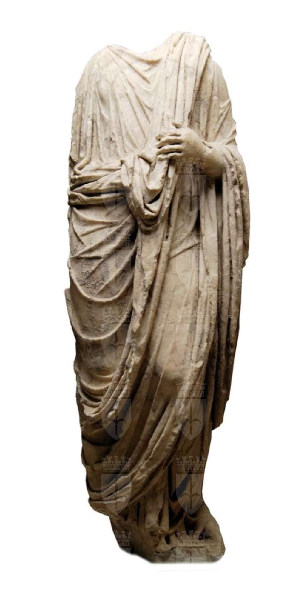 Statua, mancante della testa e del braccio destro, di grandezza poco inferiore al normale, raffigura un personaggio stante dall'ampia toga che scende fino alle caviglie e che indossa ai piedi calceus patricius. Il retro non è lavorato.