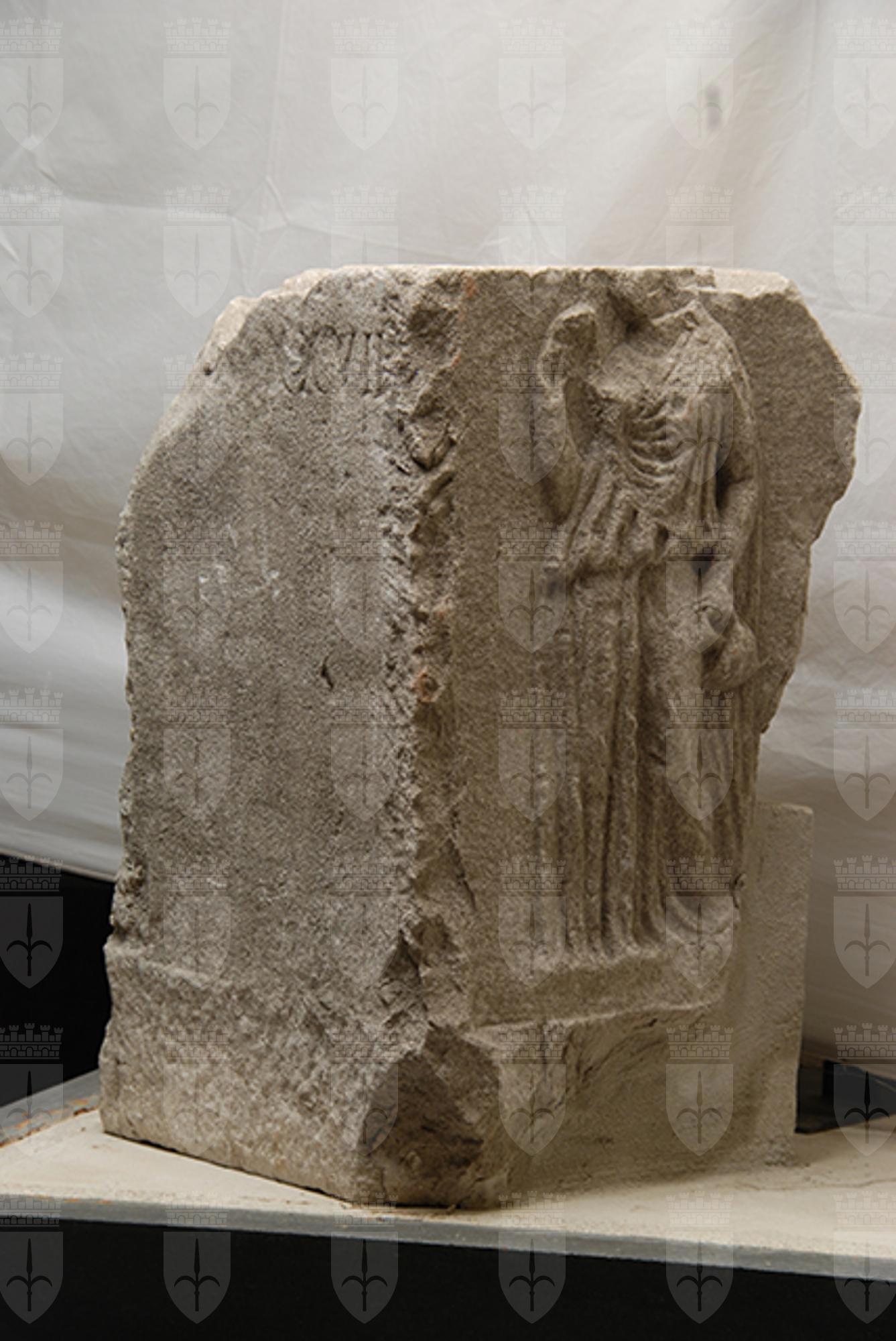 Cippo squadrato con sulla fronte l'indicazione delle misure dell'area sepolcrale e sui due lati, in rilievo, figura femminile alata che regge un urceus. L'iscrizione latina è di tipo sepolcrale.