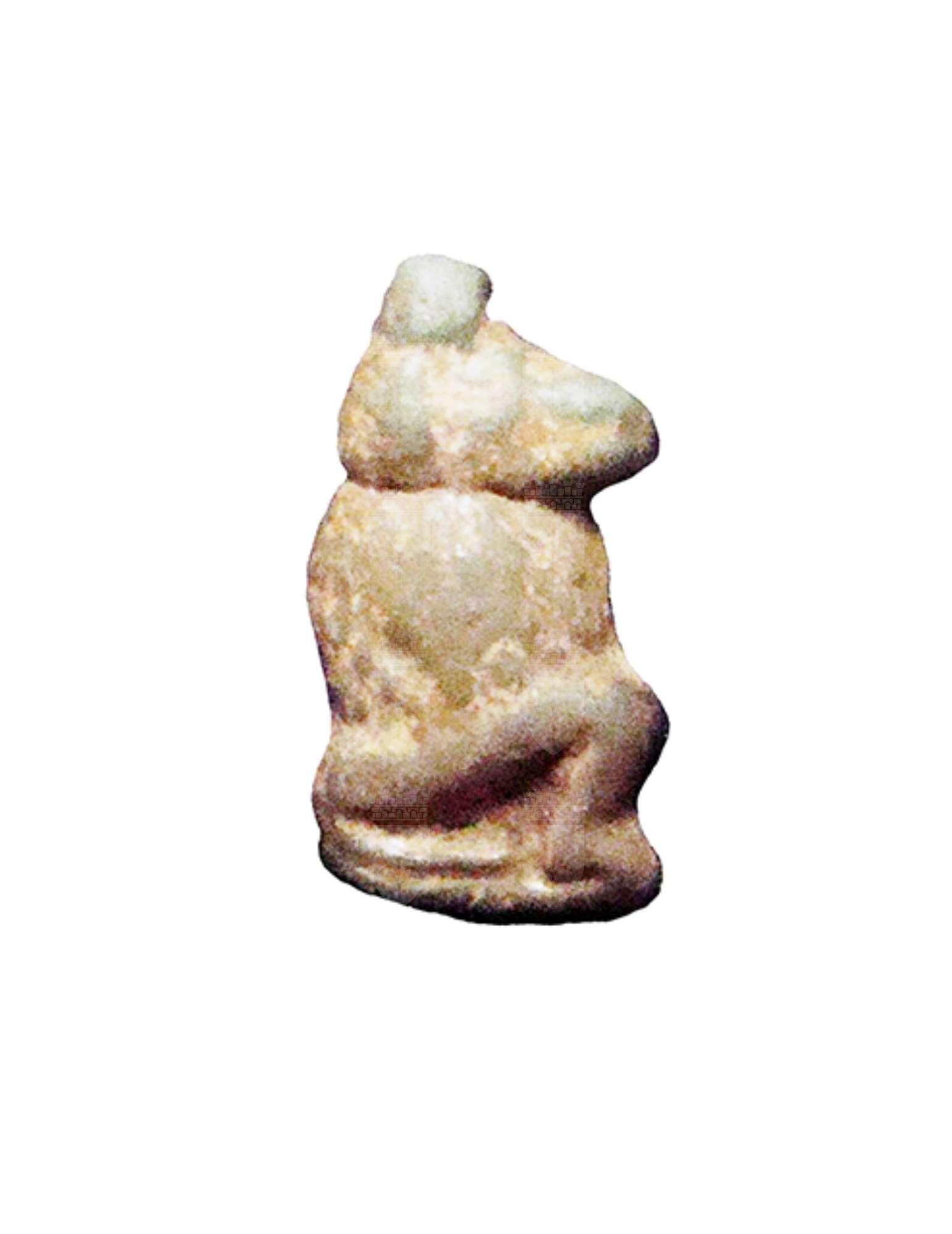 Amuleto in faience, modellato a tutto tondo, con anello di sospensione nella parte superiore. Raffigura un babbuino accucciato, che tiene le zampe anteriori poggiate sulle ginocchia. Si notano i dettagli della folta pelliccia e della coda ripiegata attorno alle zampe posteriori, che poggiano su una sottile base.