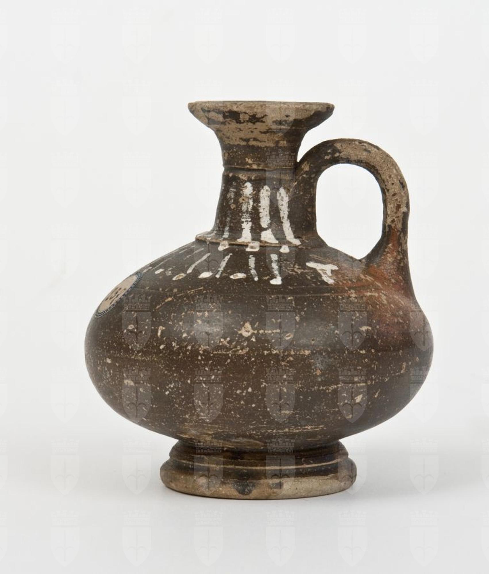 Lekythos ariballica a corpo globulare schiacciato a vernice nera tendente a tratti al grigio e a tratti al rosso/bruno con sovraddipinture in bianco. Bocchello con orlo estroflesso e labbro leggermente a tesa, collo a profilo concavo, leggermente modanato alla base e all’estremità superiore in prossimità del bocchello, corpo globulare schiacciato, ansa a nastro verticale, piede ad anello, fondo leggermente apicato. Sul collo: sequenza di bastoncelli; sulla spalla fila di punti alternati a bastoncelli seguiti da una coppia di linee incise.