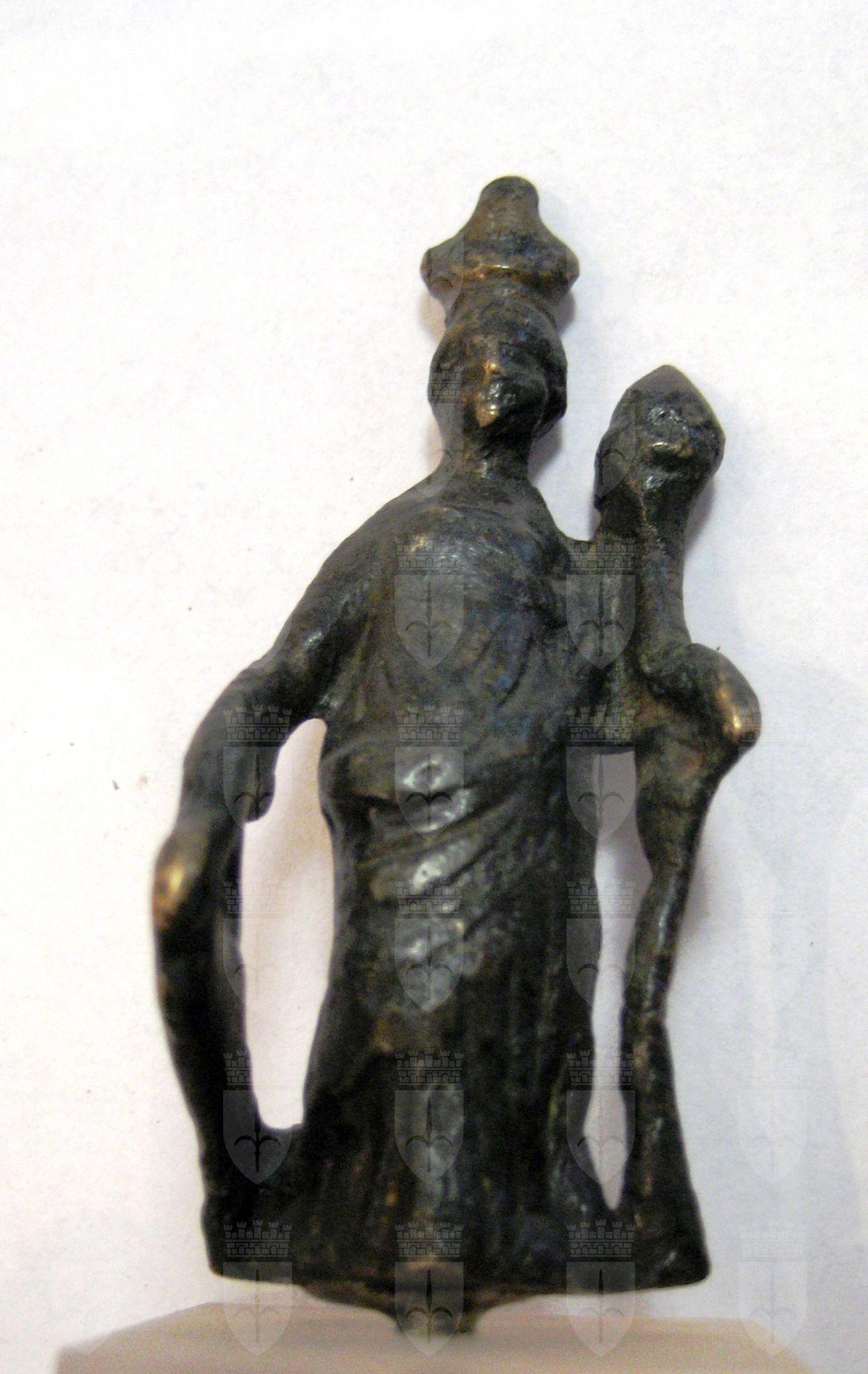 Statuina di Iside Fortuna con veste talare, mantello a tracolla sul petto e sul capo un diadema con fiore di loto. Nella destra regge un timone di nave, nella sinistra una cornucopia. Modellazione molto sommaria nel volto e negli attributi.