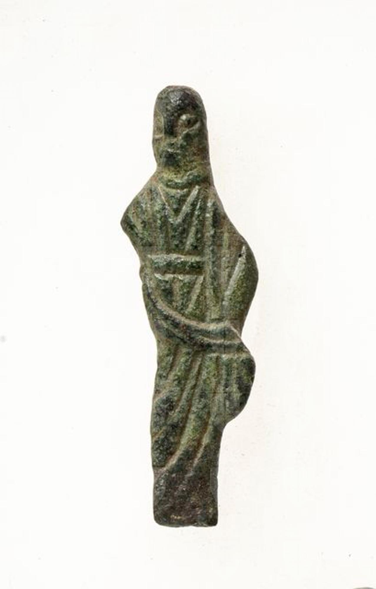 Figurina di donna. Semplicità estrema dei tratti, soprattutto del capo, privo dei capelli e volto deforme. Il pesante pannaggio che ricopre la figura è reso con l'ampio uso di incisioni.