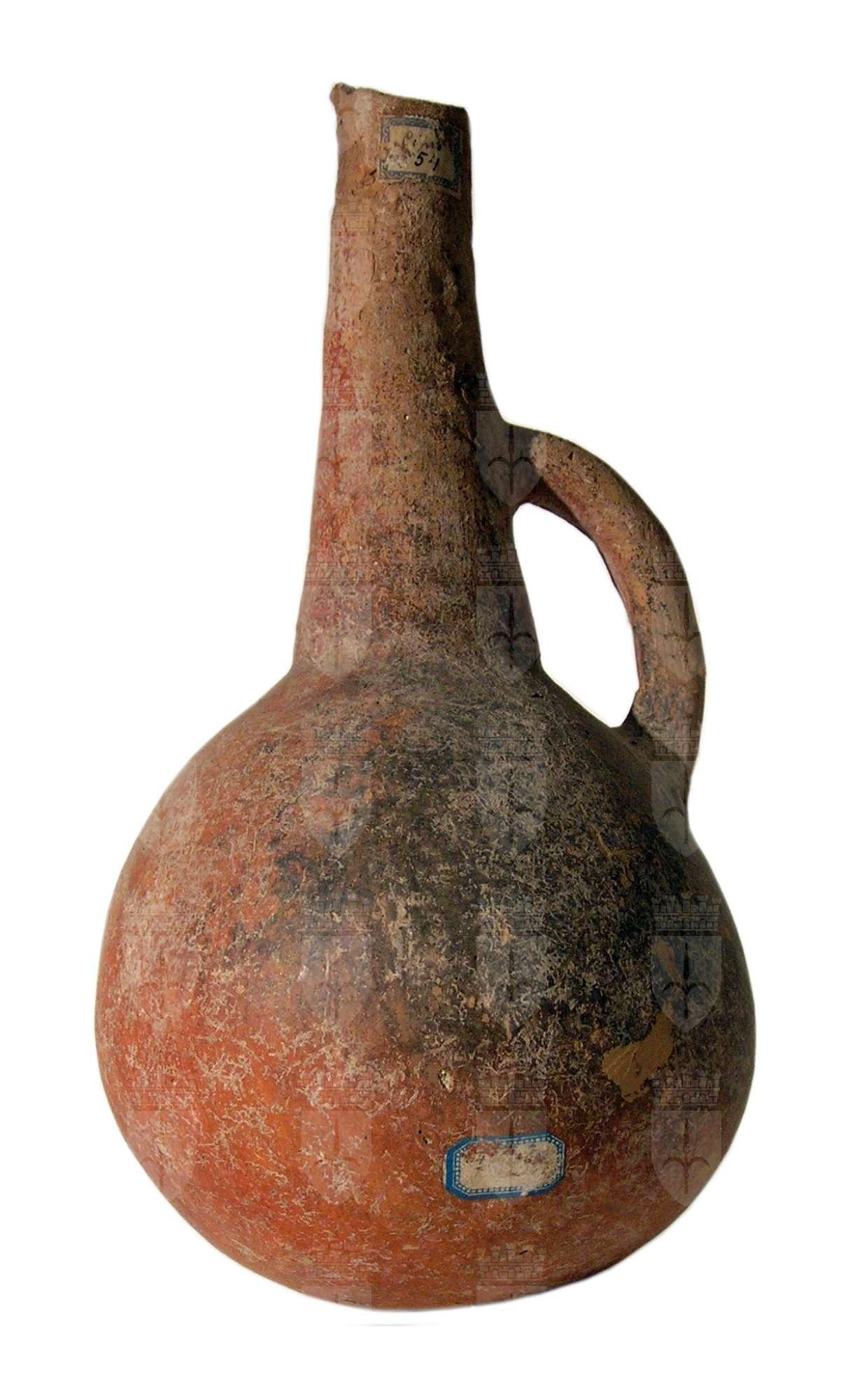 Brocca a corpo sferico verniciata di rosso con chiazze scure e priva di decorazioni. Lungo collo tronconico; ansa a bastoncello (a senzione subcircolare) impostata tra il collo e la spalla. Fondo convesso.