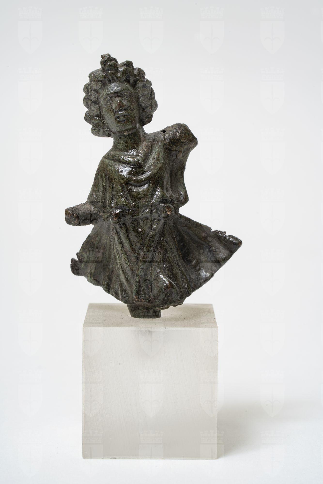 Figurina (lare?) in corta veste svolazzante, mancante di braccia e gambe. Il braccio deS. è allargato. Il volto ha lineamenti ordinati e la capigliatura lo incornicia in una specie di schematica anastolé.