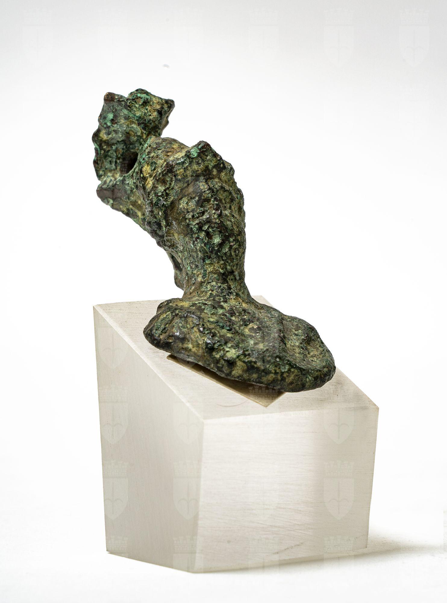 Busto femminile con clamide e corazza. Capelli a corona attorno alla testa, coperta con elmo ad alta cresta (Minerva o Dea Roma). La testa è a tutto tondo, il resto è appiattito posteriormente, come lavoro d'applicazione, forse trasformato in peso.