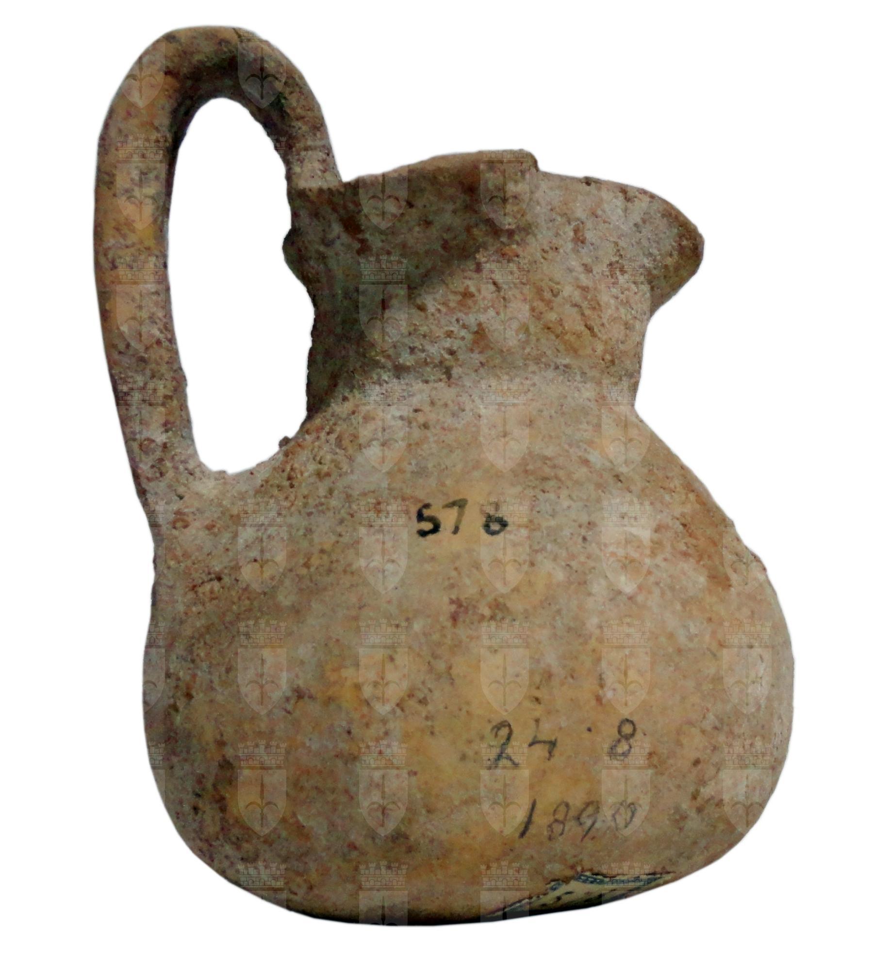 Piccola oinochoe con bocca trilobata con ventre rigonfio e ansa nastriforme sopraelevata.