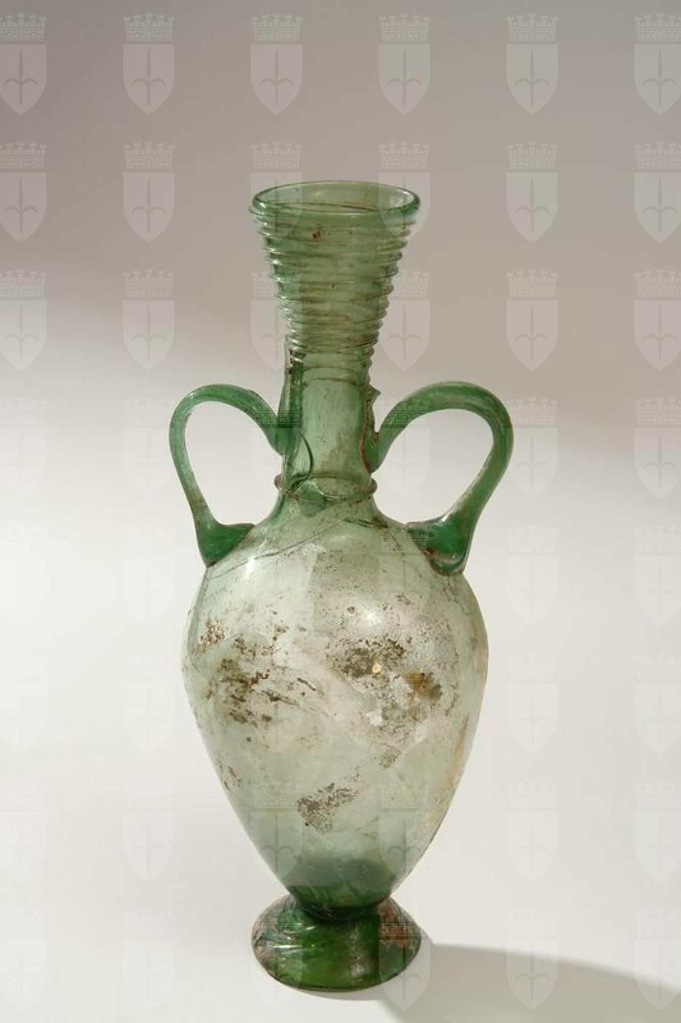 Realizzata in vetro mediamente spesso, di colore verde/azzurro, trasparente;presenta molte bolle sia piccole che grandi. Orlo leggermente estroflesso, labbro arrotondato; collo cilindrico; anse a bastoncello ad orecchia tra collo e spalla; ventre ovoidale; fondo su piede ad anello a sezione troncoconica lavorato a parte. Un filamento a spirale di vetro dello stesso colore è avvolto sotto l'orlo, un altro filamento forma un collarino alla base del collo.