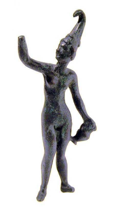 Statuetta di donna con anfora e cappello campaniforme. La figura completamente nuda rivolge lo sguardo verso l'alto, dov'è sollevata la mano destra, mancante, a reggere qualcosa. La sin. regge un'anfora per l'ansa. I piedi sono rivestiti da calzari. Dato per falso.