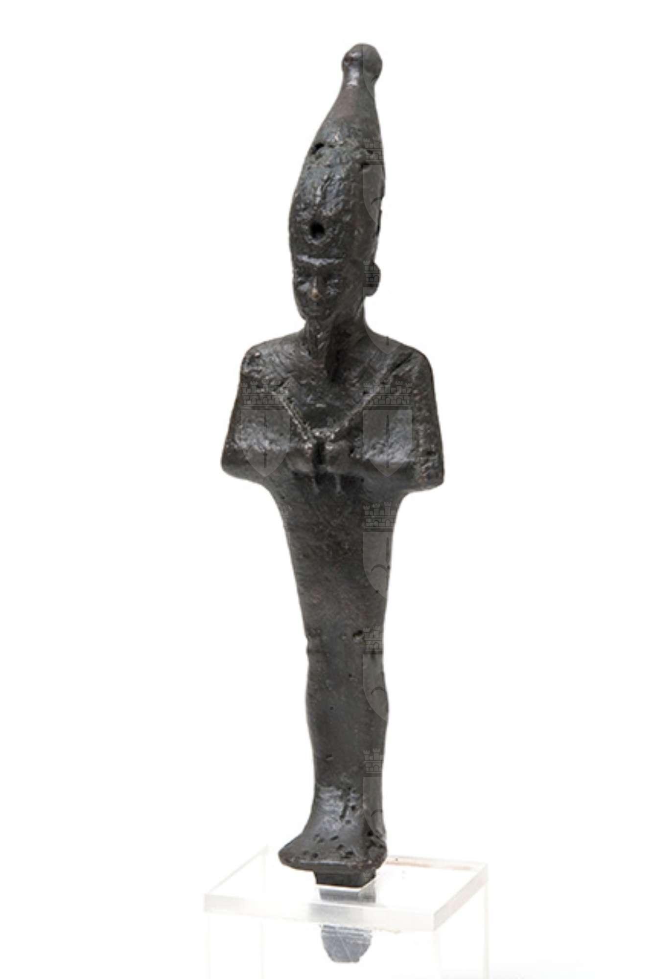Statuina in bronzo che raffigura il dio Osiride mummiforme con in capo la corona bianca dell'alto Egitto. Sulla corona dell’Alto Egitto è presente un foro dove doveva stare il cobra (l’ureo). Il dio è stante, con la barba divina sul mento e con le mani affiancate sul petto, che reggono lo scettro-heqa nella mano sinistra e il flagello-nekhekh nella destra. Sotto i piedi vi è un perno per l'infissione in una base.