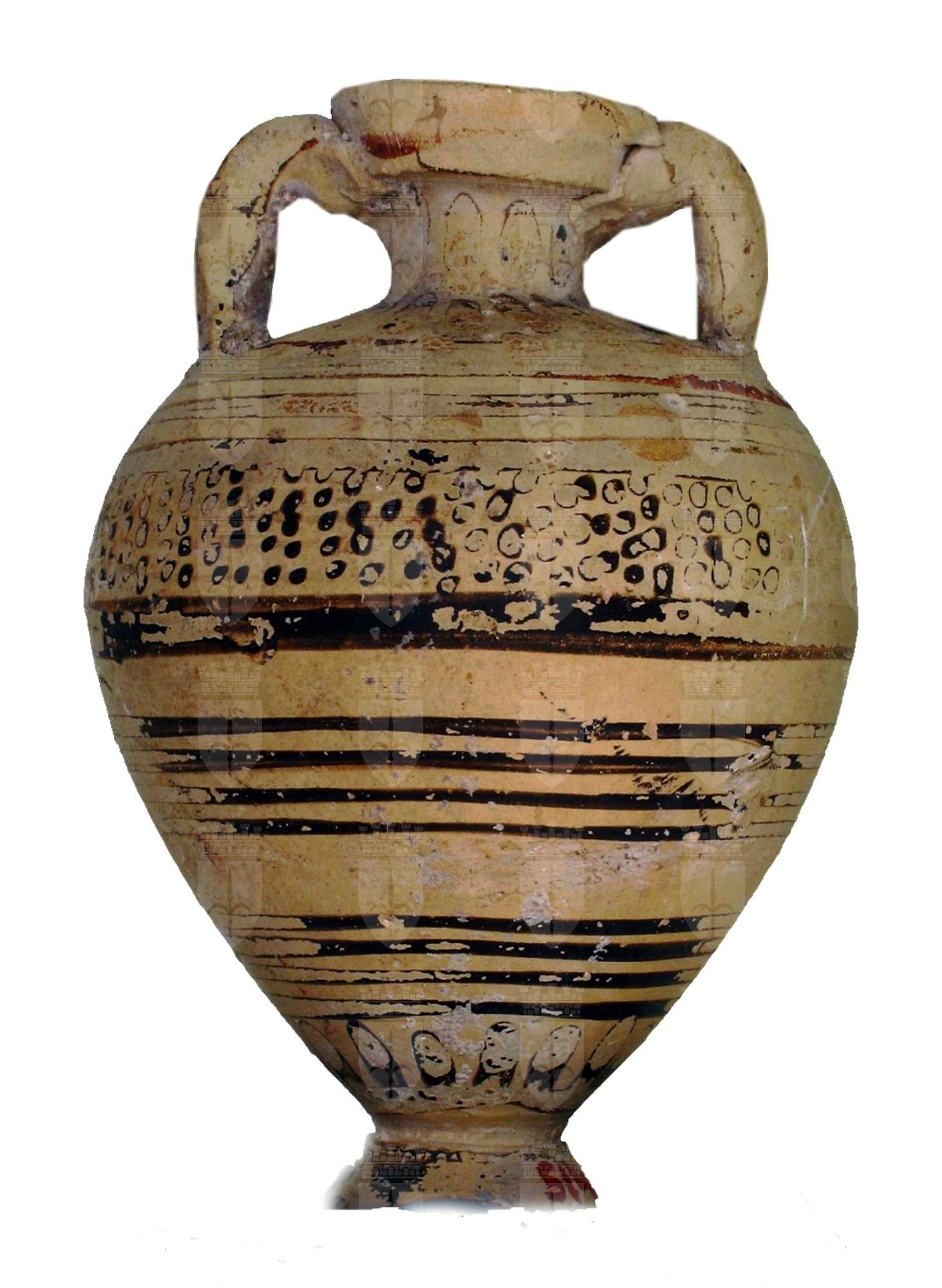 Amphoriskos terminante a punta, con due anse arcuate verticali a lato del collo in argilla chiara motivo a fasce ed ovuli di colore bruno sul ventre.