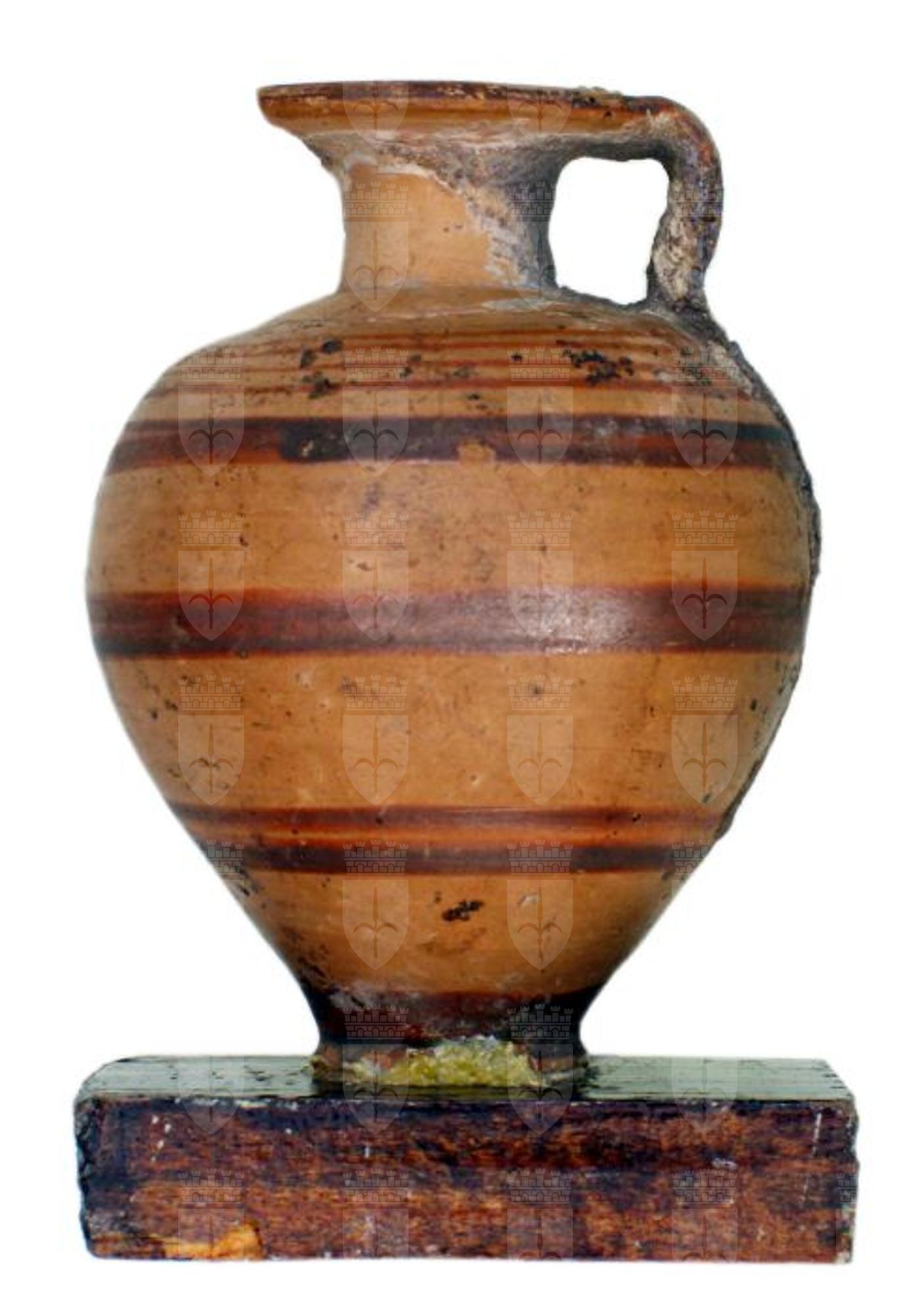 Balsamario. Orlo a tesa, collo cilindrico, corpo ovoidale, spalla carenata a profilo convesso, ansa impostata tra il bocchello e la spalla, piede a disco. Decorazione in rosso, con fasce parallele di diverso spessore alternate a fasce risparmiate sull’orlo, sulla spalla, sul ventre e sul piede. Visibili i segni del tornio.