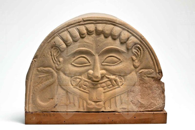 Argilla rosata, mentre in frattura assume un colore rossastro. Sono presenti tutti gli elementi canonici del gorgoneion arcaico, dalle mascelle spunta un serpente per lato.
