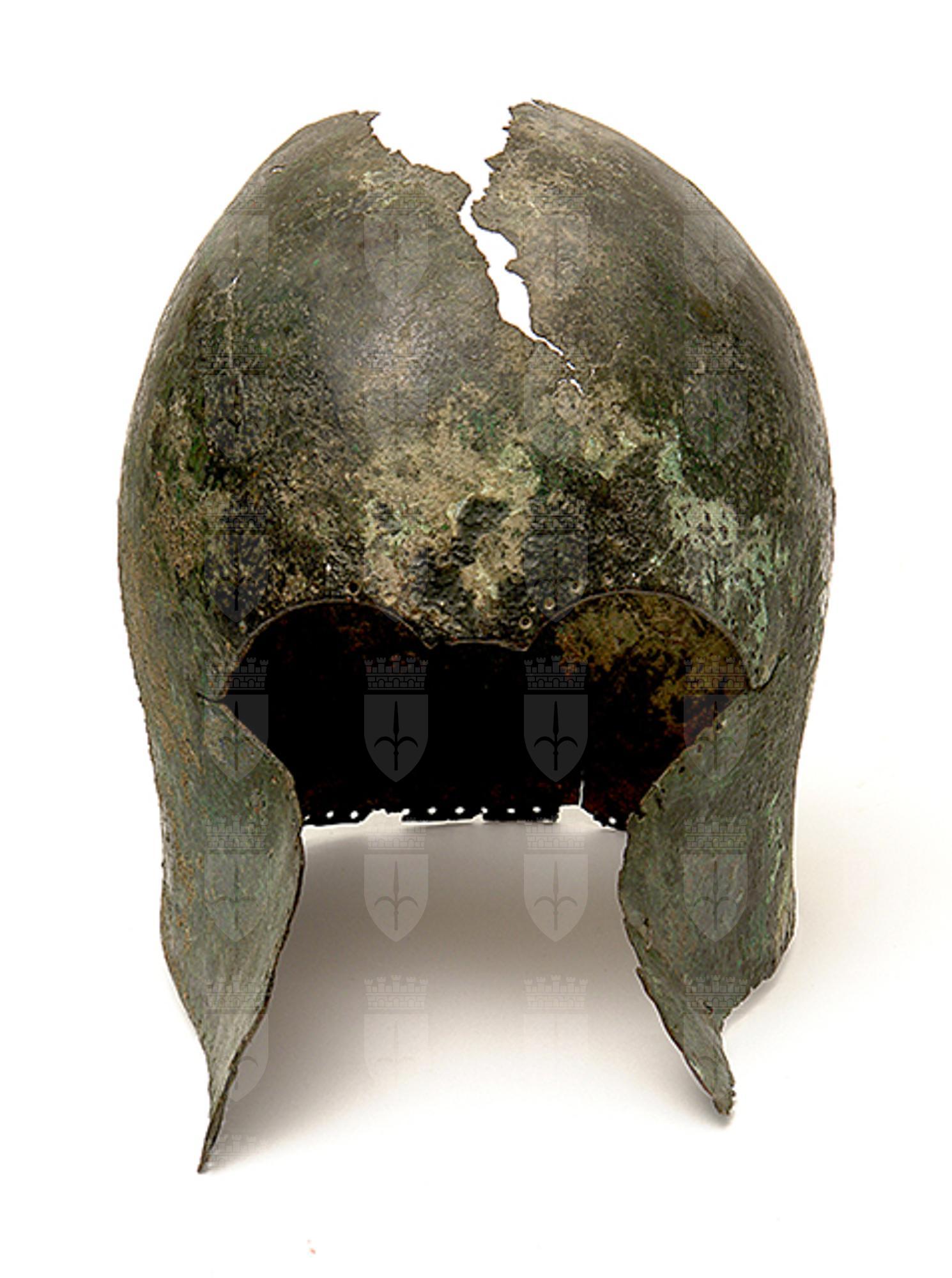 Elmo greco a calotta emisferica, con aperture per gli occhi separate dalla appendicel nasale allungata dalla punta arrotondata e dale paragnatidi. Decorato con puntinatura sorpa e sotto l'occhio e lungo l'orlo delle paragnatidi e della parte posteriore; presenta inoltre alcuni fori per il fissaggio delle parti in cuoio. La provenienza da Olimpia si inserisce tra i ritrovamenti, negli scavi, di un gran numero di elmi (più di 200): si tratta della decima del bottino sottratto ai nemici sconfitti e offerta alle divinità in ringraziamento per la vittoria ottenuta. Erano posti a formare trofei che ornavano i santuari, la cui esistenza è testimoniata dalle fonti antiche.