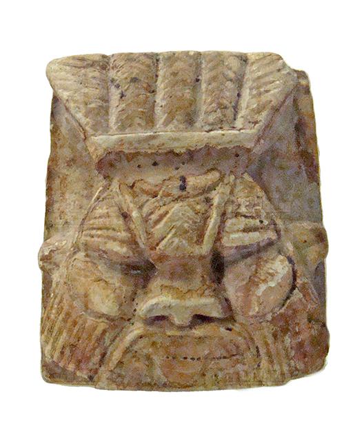 Amuleto in faience, in forma di piastrina rettangolare. Su una faccia vi è il volto del dio Bes, con la barba, le orecchie sporgenti, il largo naso piatto e le sopracciglia accentuate, con in capo la corona di piume di struzzo; sull'altra faccia, invece, uno scarabeo sormontato da due piume di struzzo si trova tra due coppie di urei, disposti araldicamente. L'amuleto ha un foro passante verticale.