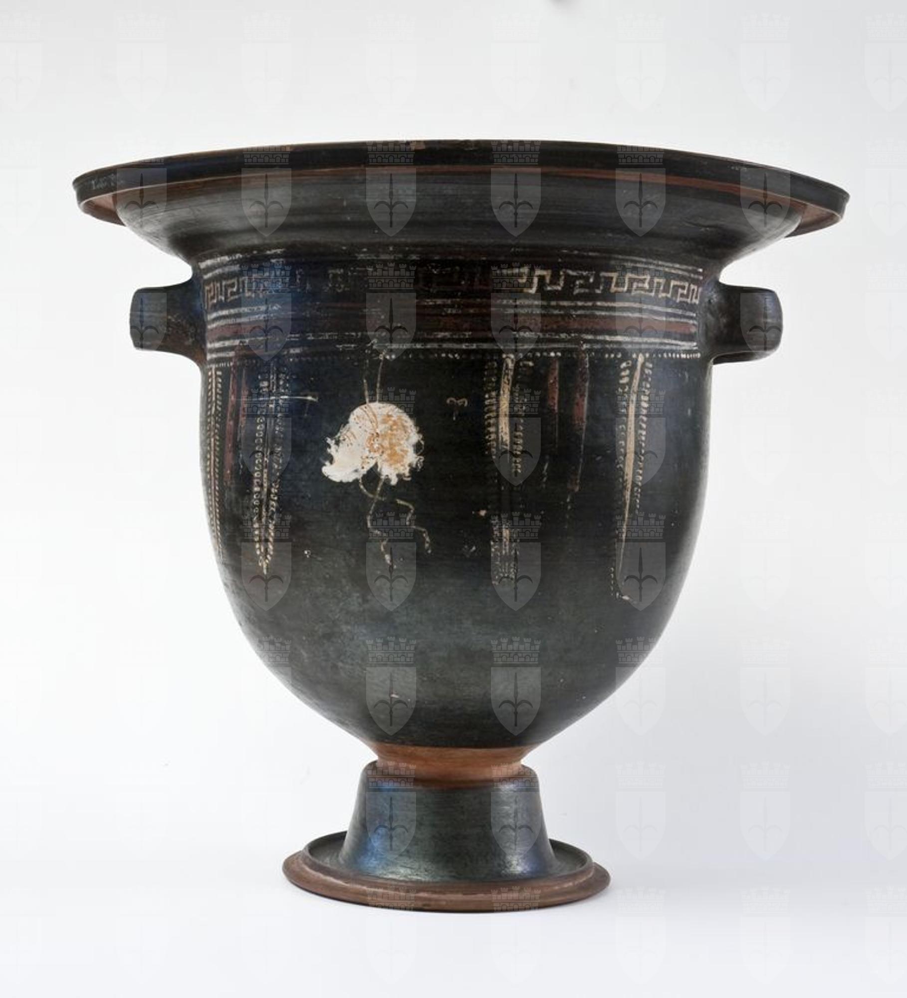 Cratere a campana con maschera a vernice nera con sovraddipinture in bianco crema, giallo ocra e rosso amaranto. Labbro revoluto modanato, orlo estroflesso, vasca profonda, anse a nastro, impostate orizzontalmente sotto l’orlo, gola di raccordo, alto piede campanulato. A: Sotto l’orlo, tra le coppie di linee dipinte in bianco, meandro in giallo su base bianca, fascia in rosso amaranto; segue, infine, una fila di punti, sempre in giallo su base bianca. Sul corpo tra due coppie di rami secchi con foglie a trattini, che inquadrano due tenie in rosso amaranto, maschera teatrale di profilo verso sinistra dipinta in bianco e giallo, tra due foglie ad Y. B: Ramo di ulivo selvatico stilizzato senza bacche.