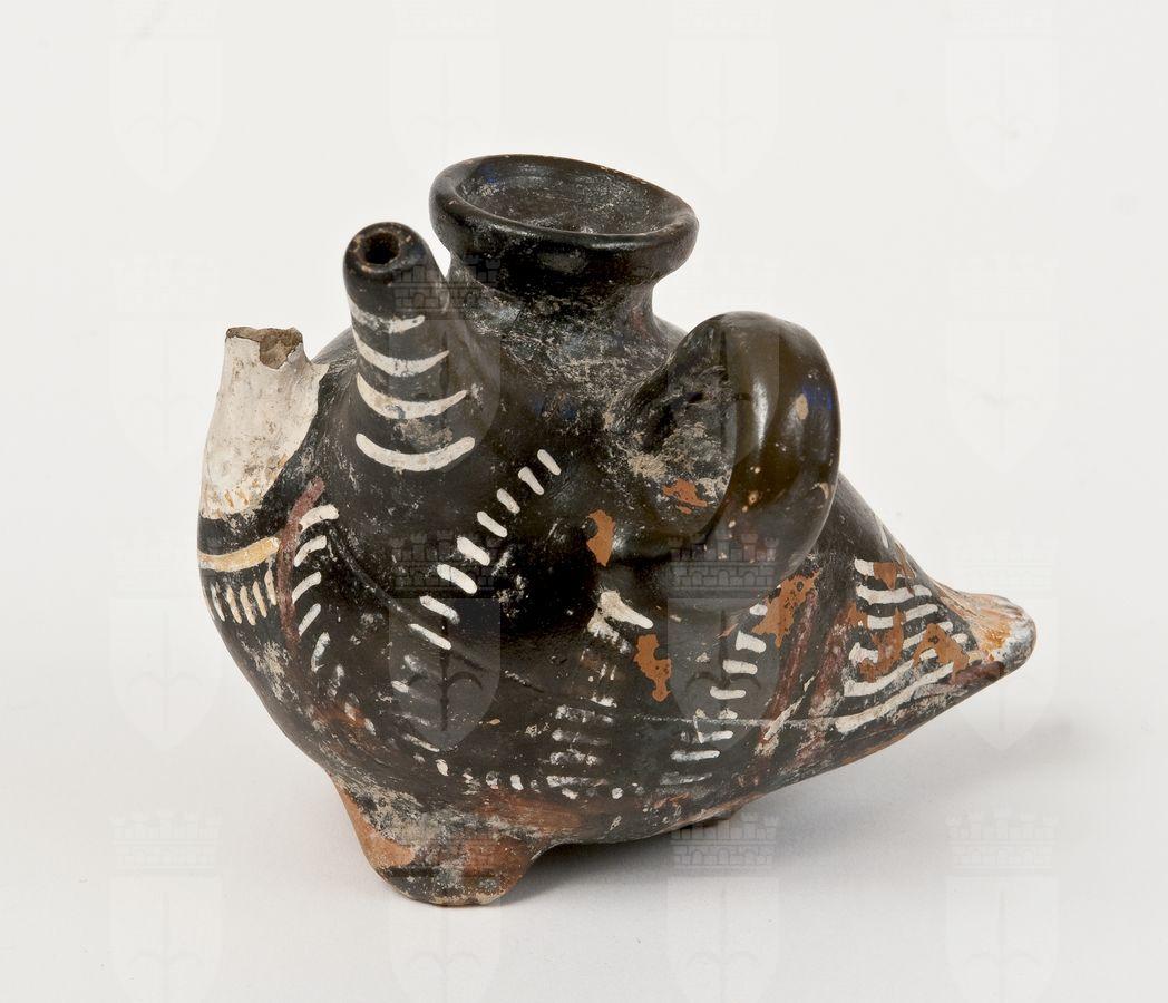 Guttus a poppatoio a forma di uccello a vernice nera con sovraddipinture in bianco, giallo e rosso amaranto. Corpo conformato a quello di un volatile, presenti sullo stesso lato sia il poppatoio che l’ansa a nastro. Corpo: decorato da linee in rosso che riprendono il profilo plastico del vaso e da bastoncelli in bianco e giallo che, in modo diverso, vanno a riempire il corpo delineato.