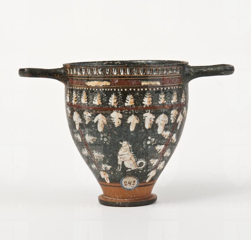 Skyphos ad anse orizzontali a vernice nera sovraddipinta. Decorazione a fasce di ovuletti, bande rosse e gialle, palmette e viticci, anche verticali sul ventre. Al centro del lato principale un cane e due rose