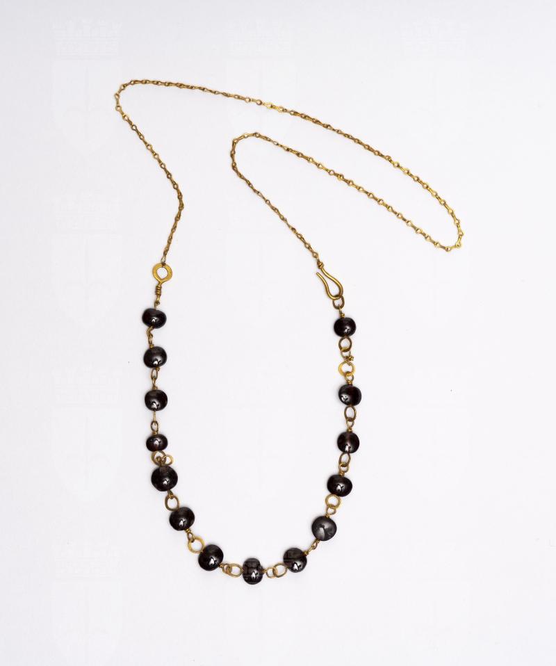 Collana formata da due segmenti di catena di tipo diverso o catena complessa costituita da un segmento di catena a loop-in-loop semplice con maglie a otto e da un segmento di catena a fixing link (Pavesi tipo X) 1. Al centro, una serie di 14 (in origine almeno 15) perline di corniola, rotonde, lenticolari, forate, sono montate con filo d’oro passante che forma un anello saldato da una parte e si richiude dall’altra formando un anellino chiuso da un avvolgimento del filo su se stesso. Questo è inserito nell’anello più grande della perla precedente: catena semplice di fixing link con vaghi, tipo VII della classificazione Pavesi. L’altro segmento è una catenella di maglie loop-in-loop semplice di filo d’oro. Il gancio della catenella è semplice, rifinito con più giri intorno alla sua stessa estremità. Le due parti sono ora legate da un filo di stoffa avvolto al gancio richiuso della catena con le perle.
