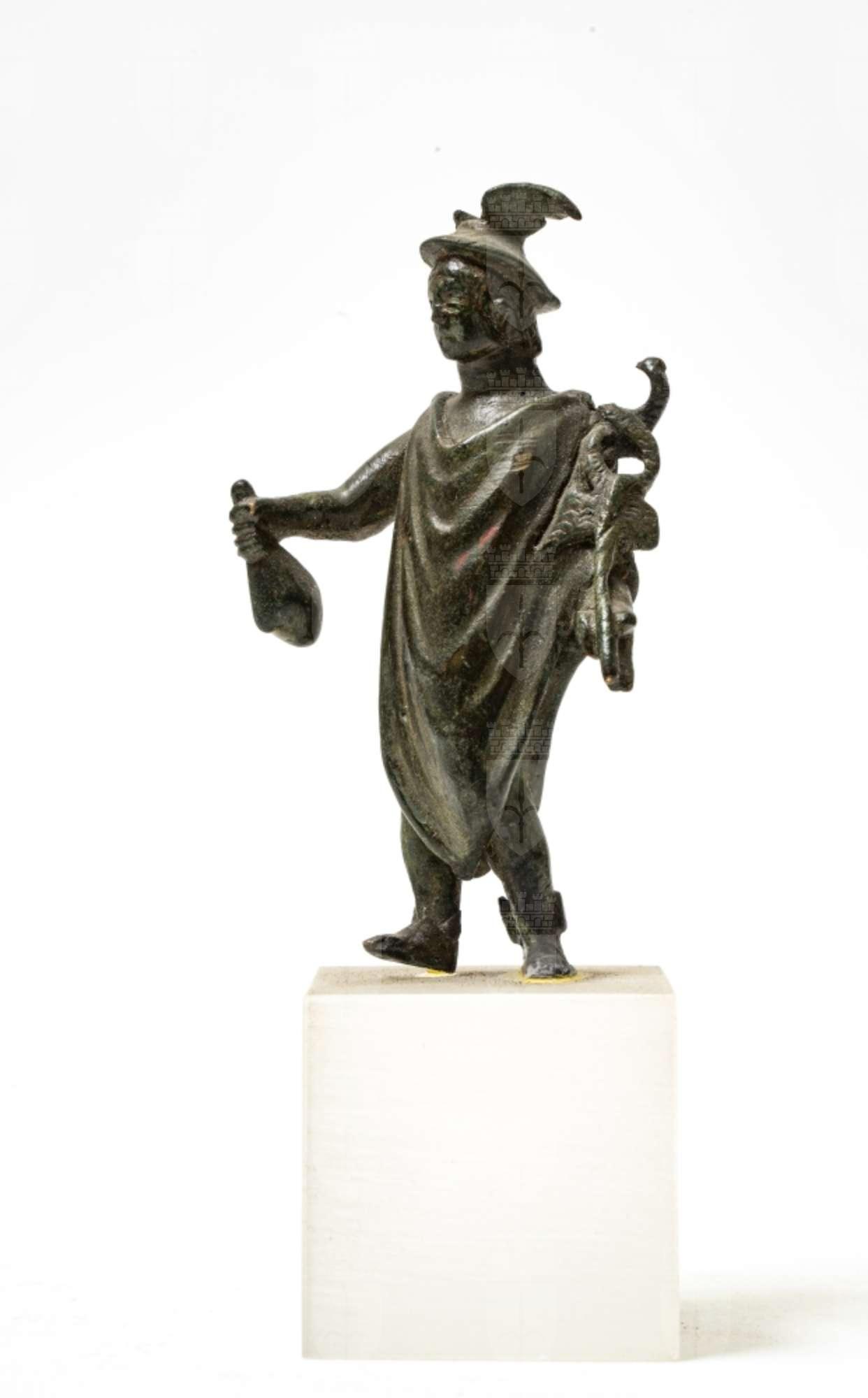 Statuetta di Mercurio appoggiato sulla gamba destra avanzata. Veste un mantello allacciato sulla spalla destra che scende in lembi davanti e dietro sino alle caviglie alate. La mano destra sporge avanti con in pugno una borsa, la sinistra regge il caduceo. Il capo è adorno di pètaso.
