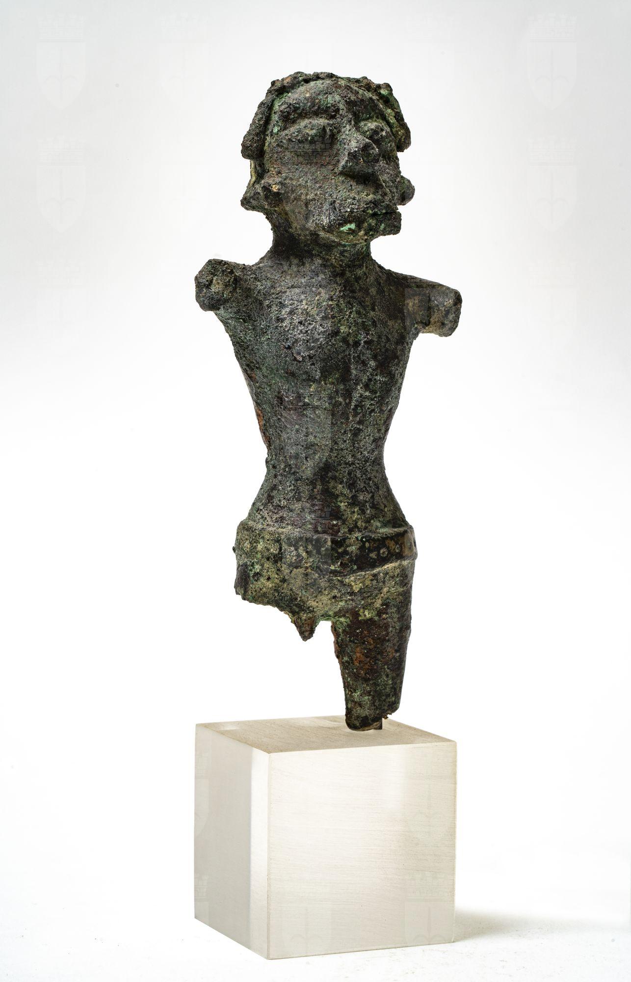 Figura stante, di gusto barbarico, presenta qualche analogia con figure di Celti. Occhi sporgenti, naso lungo e grosso, baffi spioventi, capelli disposti intorno al volto a mo' di diadema. Petto rigonfio, cintura bassa a borchie.