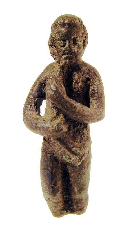 Suonatore di corno, figura maschile ignuda stante, gamba sinistra dritta, la destra leggermente flessa. Regge con le due mani un lungo corno o lituus, che aderisce al busto arrivando con la parte espansa fino all'altezza dell'inguine. Le imperfezioni tecniche, l'iconografia insolita e l'asimmetria del volto fanno presumere sia un falso.