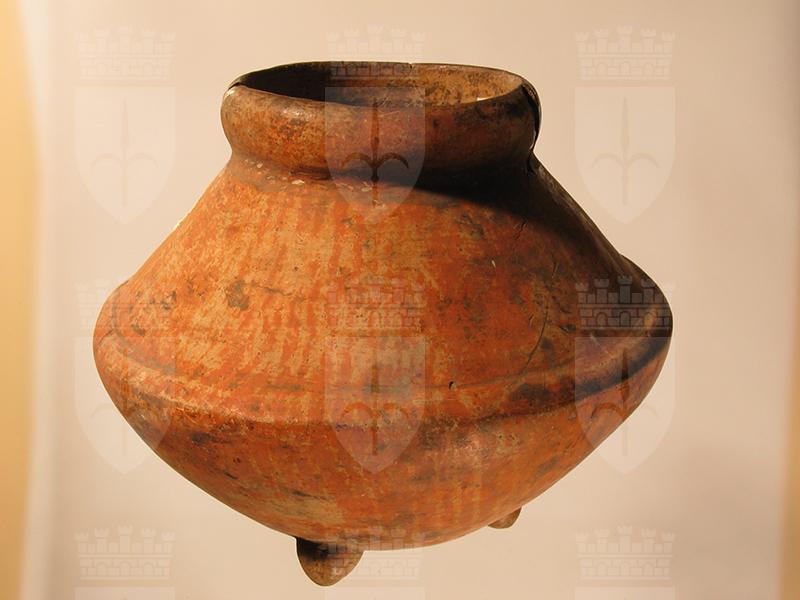 Vaso di stile Usulután di terracotta ingobbiata con una soluzione di argilla fine mista ad acqua. La superficie, ben levigata, è di colore arancio decorata con linee crema che scendono sinuose e parallele lungo le pareti del vaso. La forma è composta: la metà inferiore è emisferica con fondo leggermente convesso, la metà superiore è troncoconica, le pareti si restringono verso l’alto fino al collo. Questo è circondato da una fascia rigonfia assottigliata sul labbro. Nella parte superiore le pareti mostrano un profilo irregolare con rigonfiamenti orizzontali ad anello. Tale effetto, percettibile al tatto, è dovuto alla tecnica utilizzata per costruire il recipiente, detta colombino. Consiste nell’avvolgere a spirale un lungo cordone di pasta di argilla fino ad ottenere la forma desiderata. Gli anelli vengono poi uniti e rifiniti con le mani o con delle palette di legno. Il vaso poggia su quattro piedini emisferici pieni. La decorazione è stata ottenuta con la tecnica della pittura in negativo. Il recipiente viene ricoperto, nelle zone da risparmiare, con una sostanza che si scioglie durante la cottura o viene asportata nella fase successiva. Il motivo delle linee verticali parallele rosse su fondo chiaro è tipico della produzione Usulután. Il vaso è stato ricomposto da due frammenti e presenta due scheggiature sull’orlo.
