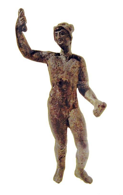 Statuetta di Mercurio con borsa nella mano sinistra e caduceo nella destra, alzata. Il capo, rivolto in alto a destra, porta il cappello alato. Piegate le ginocchia e lievemente mosse le gambe. L'espressione facciale è triste. Abbondanti forellini di fusione. Dato per falso.