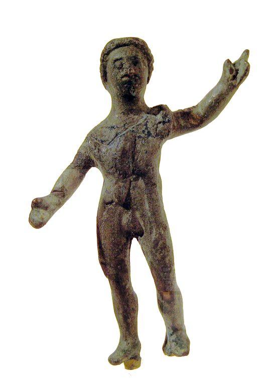 Figurina di Bacco nudo, con una pelle di pantera allacciata alla spalla, braccia aperte. Sotto i piedi, pioli per infissione. Lavoro rozzo. Il modo confuso di drappeggiare la nebride, il volto asimmetrico e piuttosto "moderno", la patina verde ancora visibile in qualche punto non sembra autentica.