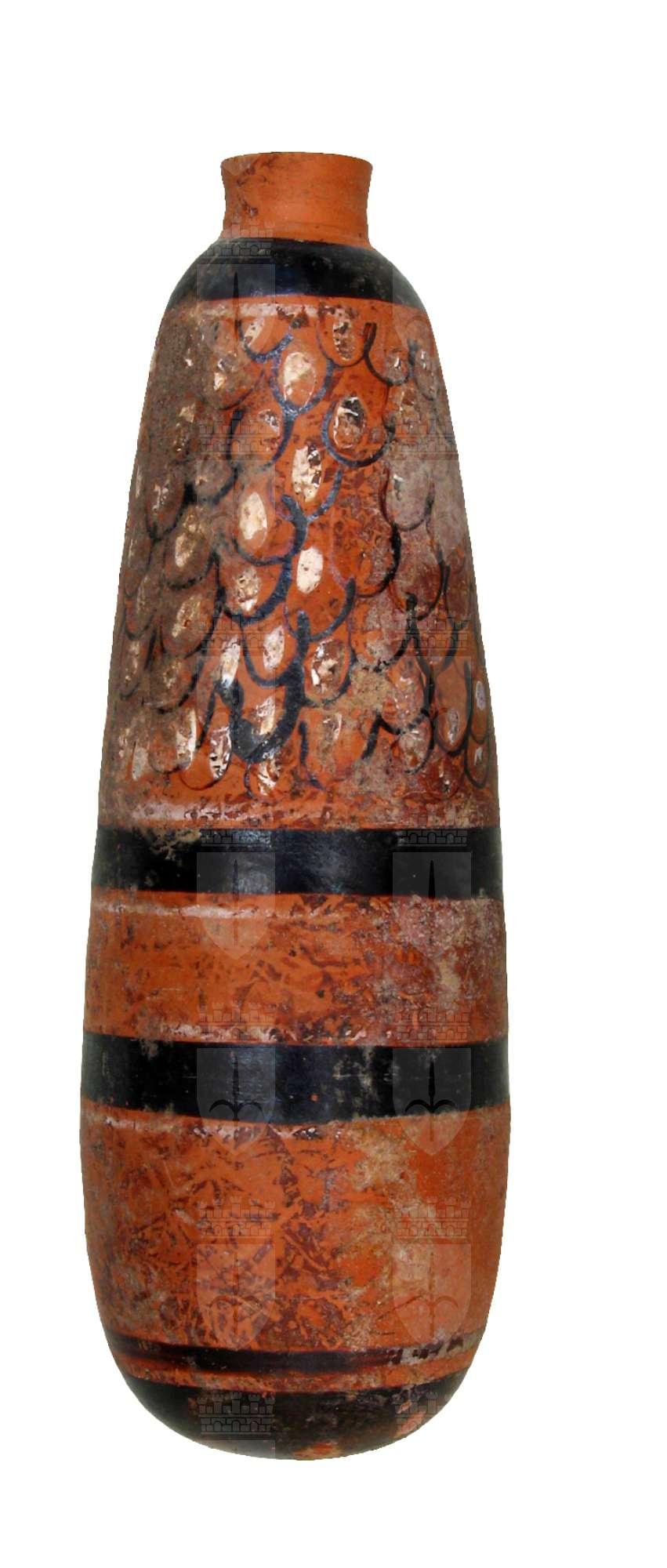 alabastron con fondo arrottondato, corpo cilindroide lievemente convesso, collarino eretto distinto dal corpo. Decorazione in nero su fondo arancio: sul corpo fasce nere di diverso spessore, con motivo a squame sovraddipinte di bianco all'interno, nella parte superiore.