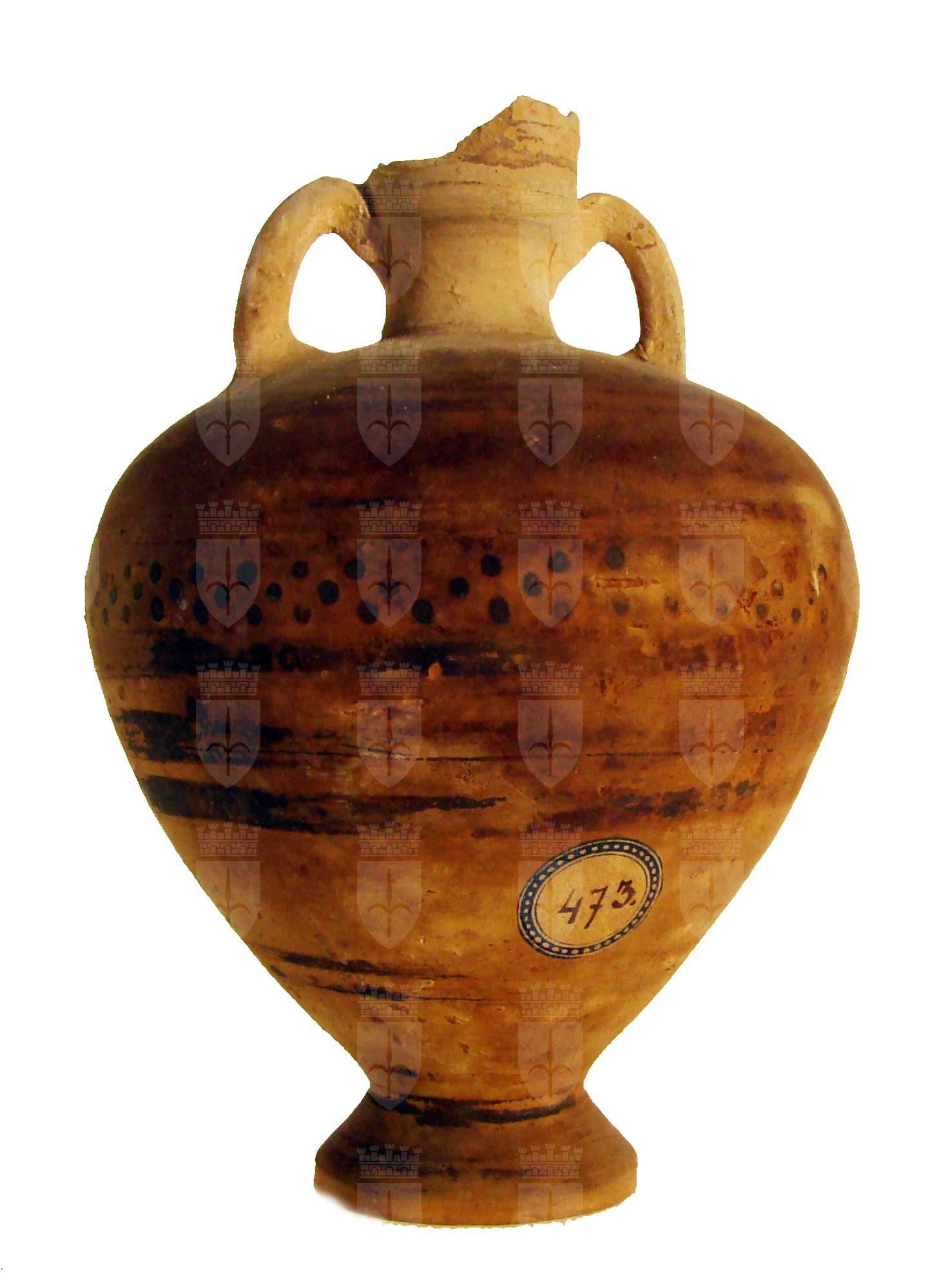 Amphoriskos a piede stretto, ventre espanso e collo stretto affiancato dalle due anse anulari con orlo leggermente estroflesso; acromo con motivo a fasce e puntini bruni.