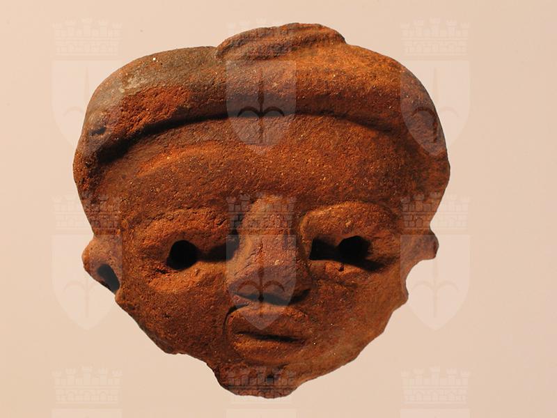 Testa umana di stile Usulután ritratta con pochi elementi essenziali e gli ornamenti caratteristici del rango: orecchini circolari, copricapo e collana. Quest’ultima era costituita da grosse perle sferiche applicate intorno al collo e oggi assenti. La bocca ha la forma di un chicco di caffè mentre gli occhi mostrano l’iride perforato. Il copricapo consiste in una sorta di fascia sormontata da un elemento in rilievo posto di traverso. Un altro simile, con tre scanalature dipinte in bianco, è applicato sulla nuca. L’ingobbiatura è in parte annerita. L’interno è cavo e presenta due fori sopra le orecchie.