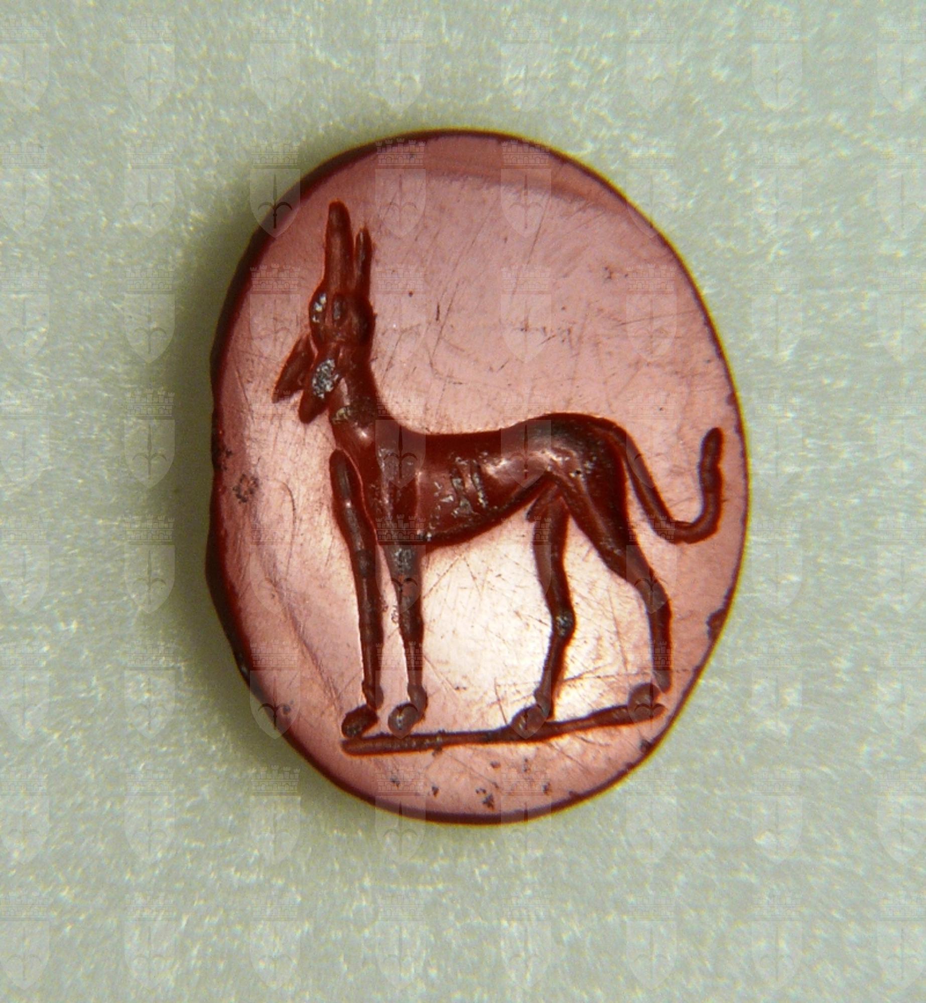 Gemma di forma ovale, piana, inferiormente troncoconica. Cane levriero stante a sinistra con la testa alzata nell'atto di ululare; linea di base.