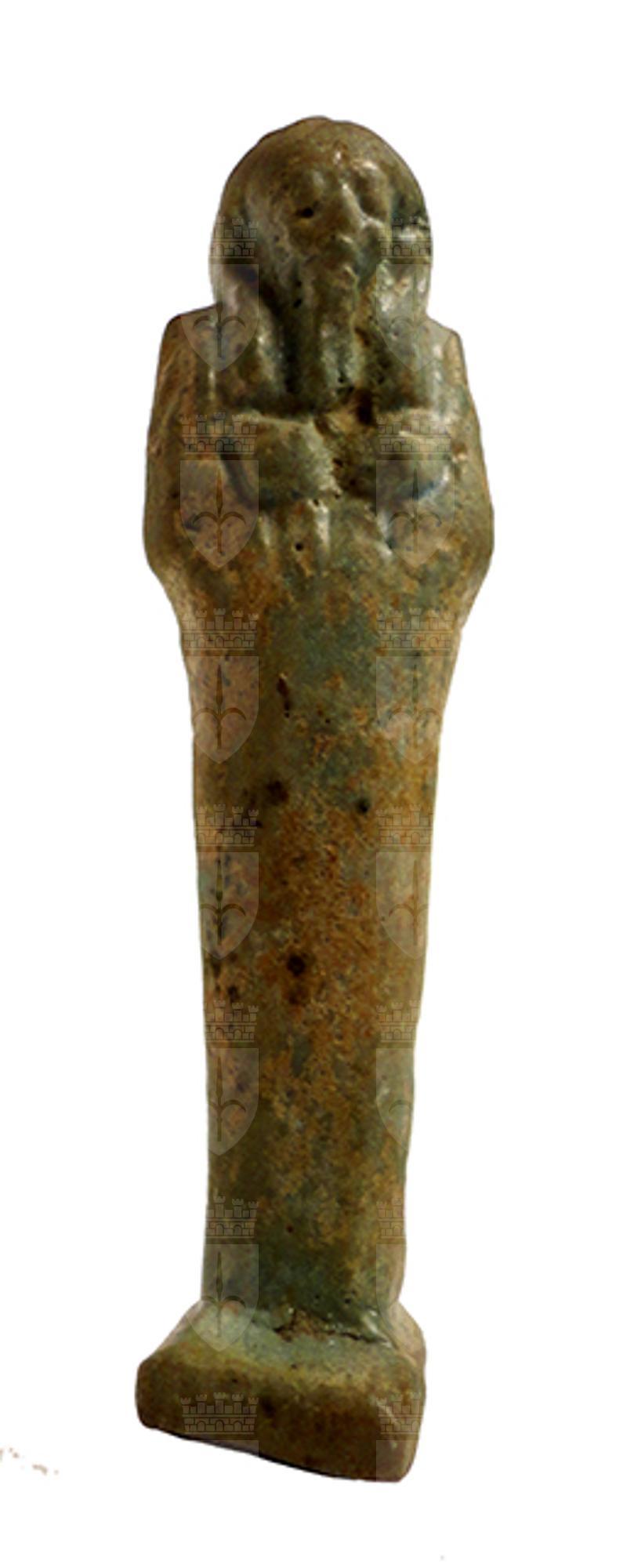 Statuina funeraria mummiforme che indossa una parrucca tripartita e la barba divina. Le mani incrociate ed affiancate portano ciascuna una zappa. Dalla spalla sinistra pende una sacca. Sono presenti base e pilastro dorsale, su cui vi è una colonna di testo, il quale risulta però completamente illeggibile.