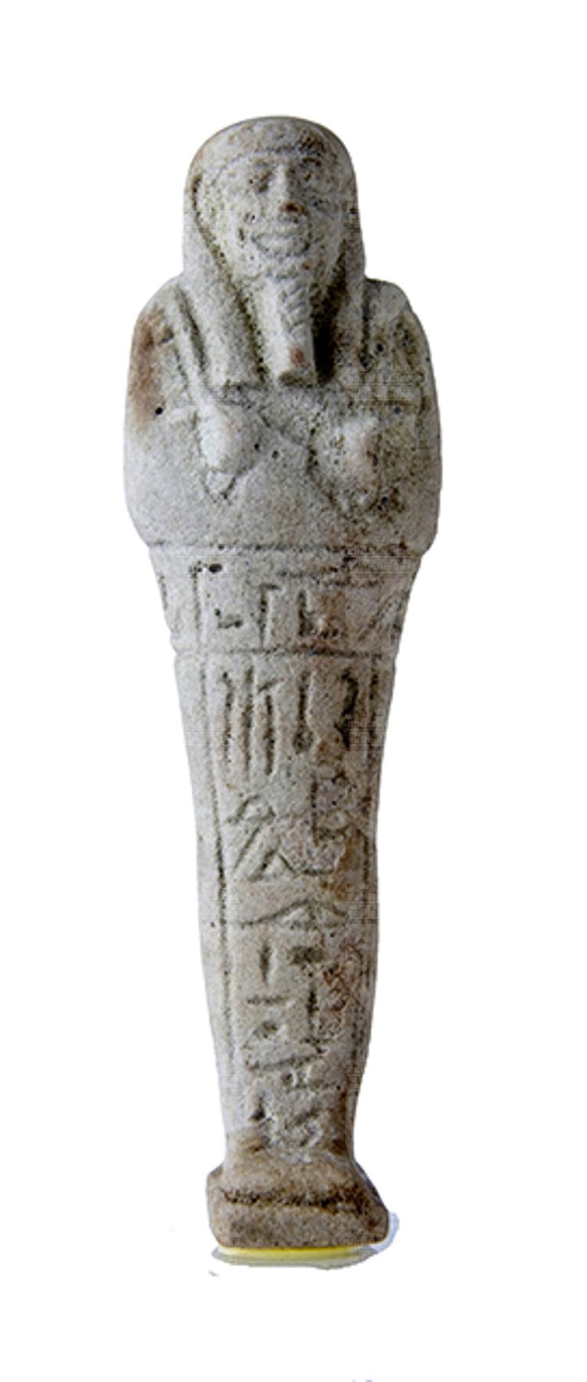Statuina funeraria mummiforme che indossa una parrucca tripartita e la barba divina intrecciata. Le mani incrociate ed affiancate portano a destra una zappa e a sinistra un piccone. Dalla spalla sinistra pende una sacca. Il pilastro dorsale e la piccola base sono presenti. L’iscrizione, che si trova sul davanti dell’ushabti, è a forma di T con linee di contorno.