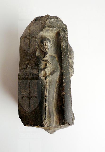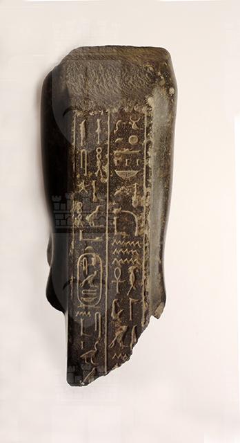 Questo tipo di statua prevedeva che il titolare delle iscrizioni fosse ritratto in piedi o in ginocchio, nell’atto di presentare il naos. Questo frammento consiste purtroppo soltanto della parte inferiore della statua, troncata a metà delle gambe e con la gamba sinistra portata in avanti (convenzione che indica l’incedere del personaggio). Della figura dell’uomo rimangono la mano sinistra, una parte delle gambe e parte del pilastrino posteriore di sostegno. La mano sinistra regge il naos con l’immagine del dio Ptah al quale manca una parte della superficie laterale destra. Il dio Ptah è raffigurato secondo la maniera tradizionale: eretto, mummiforme, la barba divina al mento, lo scettro uas tra le mani e terminante sull’estremità dei piedi. Sul retro, sulla superficie del pilastro dorsale, i resti di una iscrizione geroglifica in due colonne.