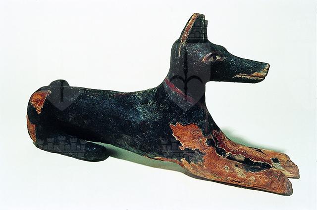 Queste figure di cane o sciacallo disteso erano normalmente poste, da sole o in coppia, sui coperchi dei sarcofagi qersu tipici della XXV dinastia. La divinità raffigurata è Upuaut, l’“apritore delle strade”, un dio di ambito esclusivamente funerario che venne poi associato ad Anubi. La sua funzione era quella di garantire al defunto un passaggio sicuro per l’aldilà. L’aspetto di Upuaut è quello tipico: un canide disteso, con le zampe anteriori allungate, il manto di colore nero, il lungo muso appuntito dalle grandi orecchie, ed una sciarpa rossa annodata al collo. La lunga coda che pendeva diritta verso il basso ora perduta, scolpita a parte, era fissata con un perno in legno, il cui foro si trova sotto la parte posteriore. La bocca, resa con un segno inciso in profondità, ha le estremità leggermente ricurve verso il basso ed è sottolineata con colore bianco e rosso. Il naso in punta ha due piccoli fori per le narici ravvicinate. Gli occhi sono bistrati in rosso con iride nera nella cornea bianca e hanno sopracciglia lineari dipinte anch’esse in rosso. Le orecchie, con interno a sottosquadro, sono danneggiate.