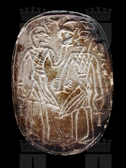 Scarabeo in steatite grigia con sul ventre raffigurazione di due personaggi maschili col cranio rasato e ureo sulla fronte. Quello a sinistra tiene un ankh nella mano destra e con l’altra porge un’anatra al secondo, il quale ha un ankh in una mano e una benda nell’altra. Dietro il capo di quest’ultimo vi sono dei segni geroglifici, forse un nome regale. Dorso con un’elaborata testa d’ariete e doppia incisione a T che separa protorace ed elitre. In basso si vede l’inizio del foro longitudinale, mai completato. Autenticità dubbia.