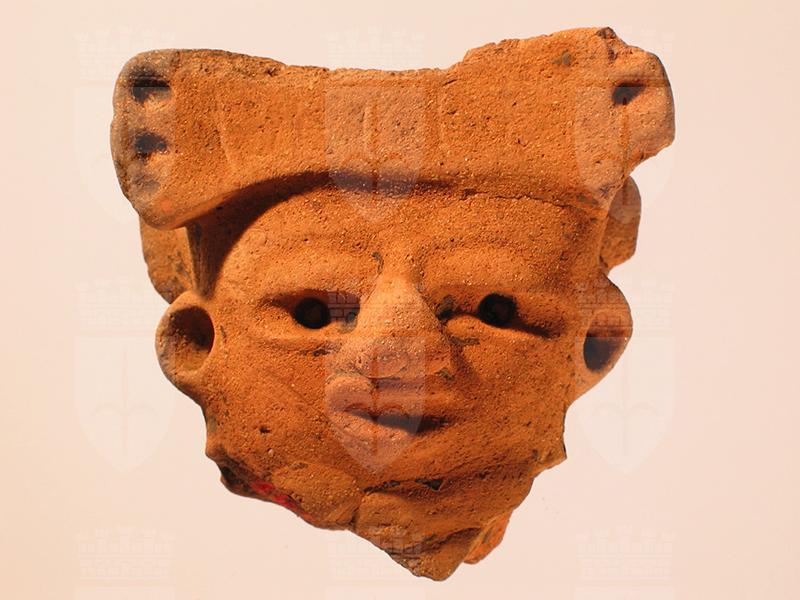 Testa umana di stile Usulután modellata a mano in terracotta color arancio. I tratti del volto sono resi secondo lo stile delle figurine Usulután. Gli occhi sono due fessure con palpebre in rilievo e iride forato. Anche le labbra e il naso sono in rilievo. Quest’ultimo termina con un appendice a doppia voluta che nasconde le narici indicando l’uso di un ornamento nasale. Le piccole cavità dell’iride recano tracce di una sostanza di colore nero. È possibile che tali fori, come quelli dei lobi delle orecchie, venissero riempiti con altro materiale decorativo (pietre dure, conchiglie, bitume ecc.). Gli ornamenti, nasali e auricolari, insieme alla collana e al copricapo fanno ritenere che l’artigiano volesse rappresentare un individuo di classe sociale elevata. La parte superiore della testa, appiattita come per una evidente deformazione cranica intenzionale, è un ulteriore indizio del rango del personaggio raffigurato. Sulla fronte campeggia una larga placca rettangolare, più ristretta al centro, che doveva essere coronata da un elemento in rilievo oggi mancante. La stessa placca è presente anche sul retro della testa. Tale copricapo rappresenta una stilizzazione del tipico copricapo con la testa di uccello in rilievo, osservabile in altri esemplari di questa collezione. L’aspetto della superficie è ruvido e alcune zone appaiono annerite da bruciature.
