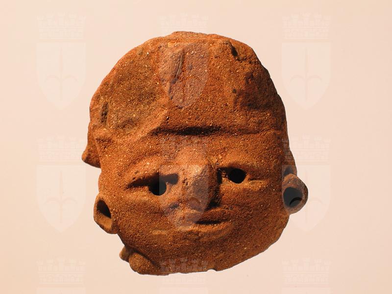 Piccola testa umana di stile Usulután modellata a pasta piena con le fattezze di un personaggio importante. I tratti del viso appaiono tutti molto ravvicinati e resi in modo schematico. Il volto mostra una forma tondeggiante mentre la fronte è appiattita e dominata da un copricapo in gran parte danneggiato. È ancora visibile, nella parte anteriore, la grande placca rettangolare che ornava il davanti del copricapo, con i due nastri pendenti in rilievo. La collana a grosse perle che cingeva il collo resta solo in tracce; integri gli ornamenti auricolari a cerchio con ampio foro al centro.