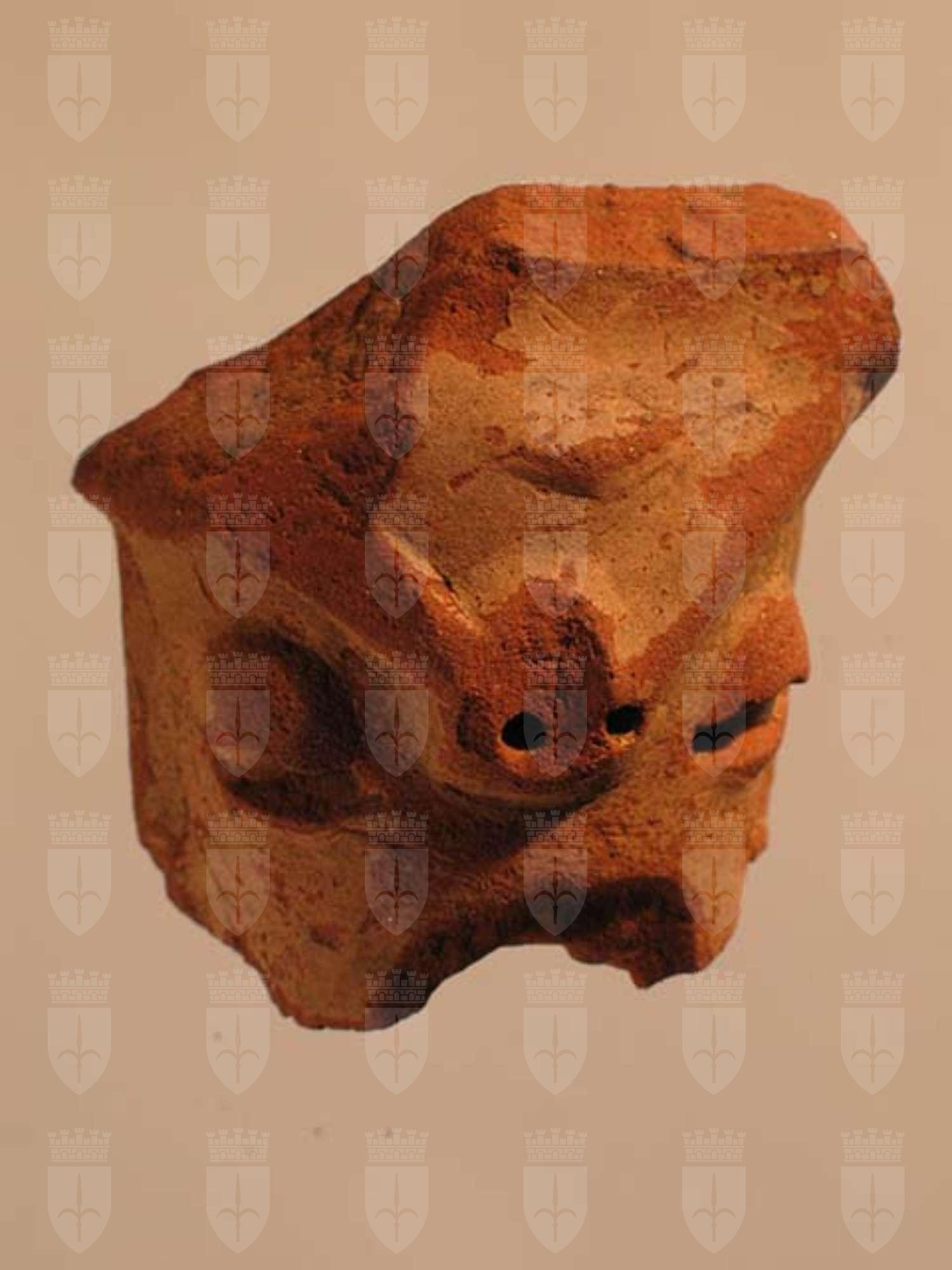 Piede di vaso di stile Usulután con interno cavo e di forma troncoconica. Il frammento è privo della parte inferiore. È lavorato con argilla rossa e rivestito da uno strato di pittura crema. Sulla faccia anteriore è raffigurato un volto umano stilizzato. Di questo sono ben evidenziati gli occhi, con palpebre in rilievo e fessura centrale, il naso e le arcate sopracciliari, ben scolpite anche se danneggiate da scheggiature e abrasioni. La parte superiore è concava in quanto costituisce parte del fondo del vaso al quale il piede era applicato. Probabilmente aveva anche la funzione di sonaglio.