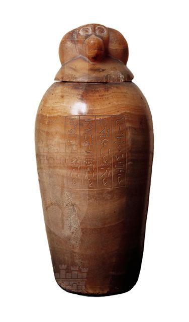Vaso in alabastro la cui funzione era quella di contenere i visceri mummificati del defunto cui apparteneva. Il corpo del vaso è panciuto e dalla spalla alta, il coperchio è configurato a testa di babbuino e rappresenta il genio funerario Hapi. Sul corpo è inciso un riquadro che contiene quattro colonne di iscrizione geroglifica.
