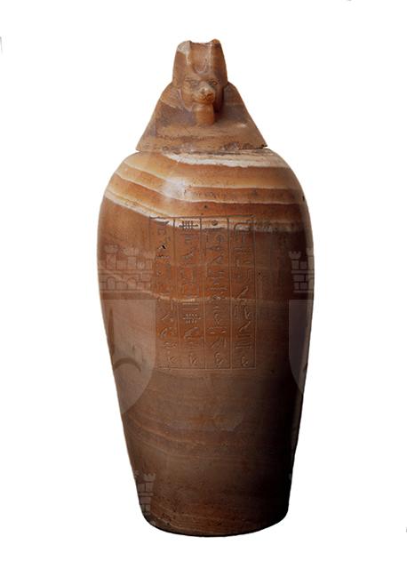 Vaso in alabastro la cui funzione era quella di contenere i visceri mummificati del defunto cui apparteneva. Il corpo del vaso è panciuto e dalla spalla alta, il coperchio è configurato a testa di sciacallo e rappresenta il genio funerario Duamutef. Sul corpo è inciso un riquadro che contiene quattro colonne di iscrizione geroglifica.