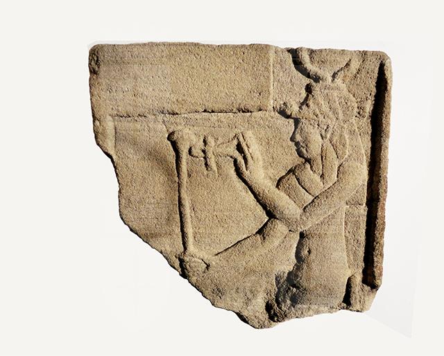Frammento parietale in arenaria proveniente, come ricordato dal donatore Giuseppe de Pollo, dal complesso templare dell’isola di File: da un monumento architettonico a riquadri. Il pezzo ha forma rettangolare con lato sinistro regolare e parte superiore del lato destro rifiniti, mentre è inferiormente troncato in modo irregolare. Il rilievo presenta una figura femminile seduta verso sinistra, spezzata sulla linea del trono a bassa spalliera, con in capo le corna hathoriane poggiate sulle spoglie dell’avvoltoio. La lunga parrucca ricade sulla schiena.Tiene il braccio destro proteso in avanti, verso il basso, e stringe nella mano lo scettro di papiro; il braccio sinistro è flesso con la mano verticale aperta dal palmo rivolto in avanti a “offrire” il geroglifico sa (cioè “protezione”). Davanti ad essa doveva dunque esserci un’altra figura, probabilmente di un sovrano. Il fatto che, tuttavia, la zona di fronte al volto della dea sia rilevata rispetto al resto fa pensare che la lavorazione non sia stata terminata: è possibile che in quest’area si intendesse incidere il testo che identificava la divinità.