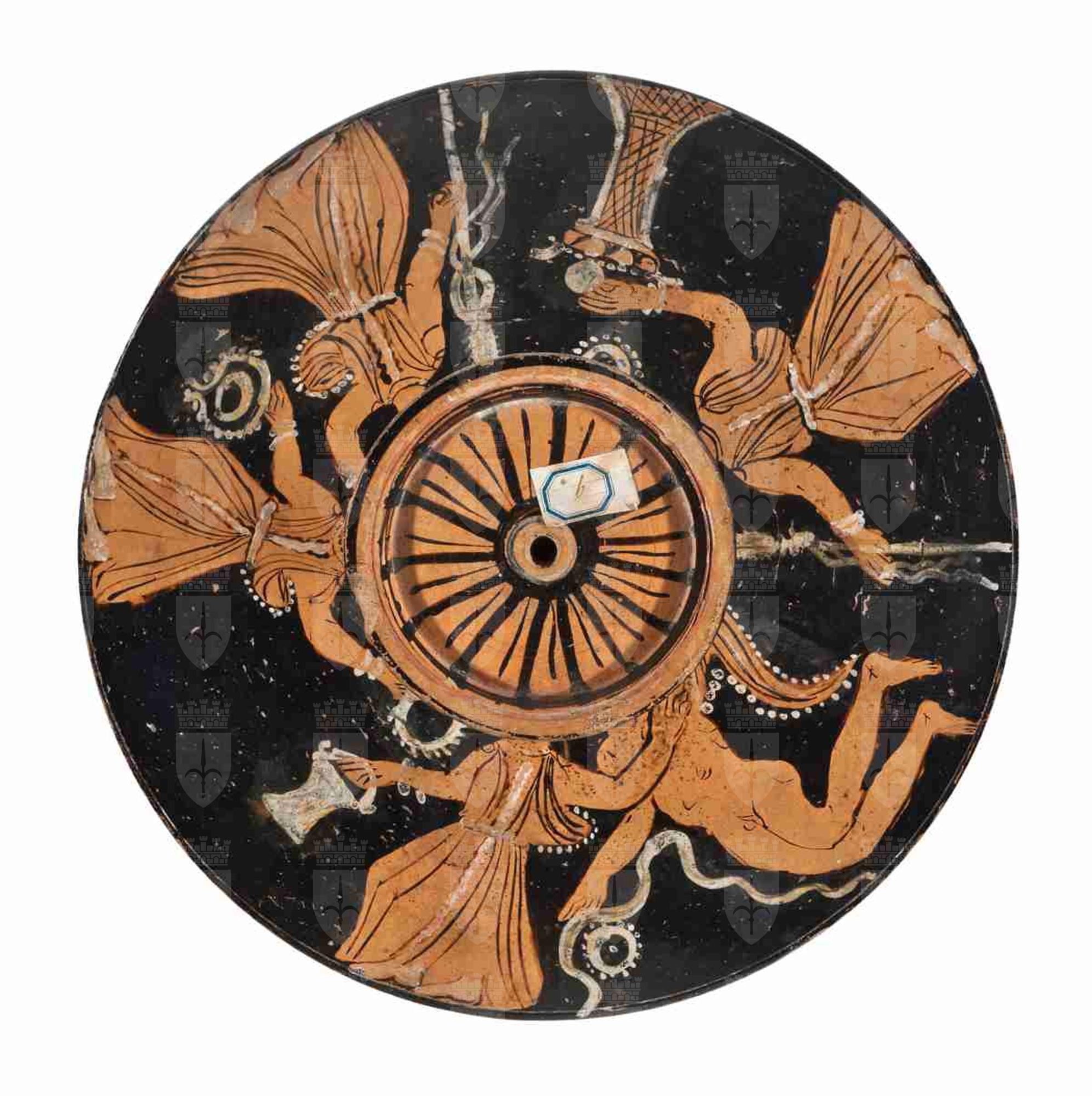 Il coperchio, pertinente alla lekanis 5387, presenta una forma tronco-conica, con un alto stelo verticale. La presa ha un'impugnatura modana-ta, dall'alto orlo piatto, rilevato e con scanalatura circolare; di profilo presenta un listello aggettante, una fascia a profilo tronco-conico rovesciato ed un elemento ad echino. Lo stelo si attacca al coperchio con un listello a rilievo. La vernice nera è piuttosto opaca, uniforme sul corpo e all'interno e visibilmente diluita sullo stelo del manico; molti dettagli e soprattutto gli attributi sono resi con sovradipinture bianche, in molti casi parecchio sbiadite. Il colore dell'argilla è Munsell 5YR 6/6 (reddish yellow). La decorazione principale, che si sviluppa attorno allo stelo, è a tema dionisiaco ed è composta da un erote alato e quattro menadi danzanti, incedenti in senso orario, dalle proporzioni piuttosto approssimative e dettagli molto semplici e corsivi. L'erote alato è nudo, di profilo a sinistra, di dimensioni sensibilmente più grandi rispetto alle menadi: occupa l'intero spazio destinato alla decorazione figurata, ma le gambe, di profilo, sono flesse, come fosse in ginocchio. Anche l'ala è flessa e di profilo, decorata con motivi lineari bianchi e neri ed è orlata da una fila di punti bianchi. La figura porta i capelli raccolti in un sakkos ornato da perline e sovradipinto in bianco e sorregge con il braccio destro, l'unico visibile, un serto e una tenia, anch'essi in bianco. Si nota l'assenza del braccio sinistro, che dovrebbe essere in primo piano: al suo posto una fila di linee arcuate, forse linee guida per la pittu-ra del braccio stesso. Le quattro menadi risultano vestite tutte in maniera molto simile: capelli raccolti nel sakkos, in alcuni casi ornato da perline e sempre sovradipinto in bianco, lungo chitone smanicato e fissato sulle spalle da fibule, cinto in vita da una cintura e ornato da una linea verticale (le cinture e le linee verticali dei chitoni sono sovradipinte in bianco); in quasi tutti i casi, l'orlo svolazzante del chitone è ornato da una fila di perline. Le fanciulle portano inoltre una collana di perle e bracciali, tutto reso in bianco; i piedi, pur molto sbiaditi, erano anch'essi bianchi, forse ad indicare dei calzari. Procedendo in senso orario, la prima menade, perfettamente di profilo e incedente verso sinistra, regge una situla, sovradipinta in bianco, nella destra e porta il braccio sinistro all'indietro, a toccare la spalla destra dell'erote. La successiva, di profilo e incedente verso sinistra, ha però il volto rivolto verso destra; in entrambe le mani, la sinistra protesa all'indietro, regge un serto reso in bianco. La terza menade, di profilo e incedente verso sinistra, regge un tirso con una tenia, sovradipinto in bianco, nella destra e porta la sinistra a toccare la nuca della menade precedente. La quarta e ultima menade, incedente e di profilo a sinistra, non presenta ornamenti sull'orlo svlolazzante del chitone; con la mano destra regge un tirso con una tenia, mentre con la sinistra appoggia un offerta, forse un uovo, su un altarino in forma di cesta rovesciata. L'altarino presenta già alcune offerte, in particolare dei fichi, e i suoi contorni sono sovradipinti in bianco. In alto a destra della figura, compare, sospesa, una ghirlanda. La decorazione accessoria comprende un motivo raggiato sotto al piede, dipinto in nero, composto da un cerchio centrale, con quindici raggi più spessi alternati ad altrettanti raggi più sottili. Lungo l'orlo compare un motivo a onde marine rovesciate sinistrorse. All'interno si conserva una vecchia etichetta recante, tra le altre cose, anche la data di acquisizione da parte del museo ('7743 16 febbraio 1904 N1 coperchio') e un'altra sul manico ('9').