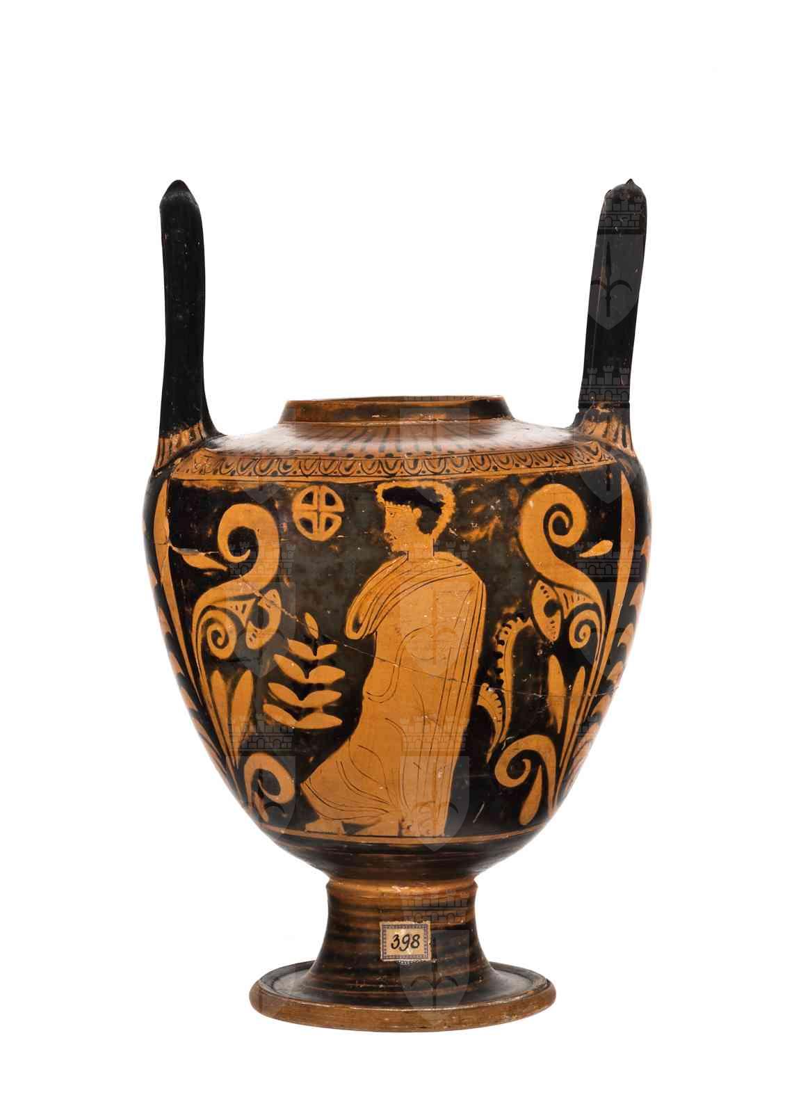 Argilla giallo rossastra (5 YR 6/6 Munsell); vernice lucente, di buona qualità, abbastanza ben conservata sebbene ci siano zone in cui appare diluita, il che ha causato problemi di cottura, specialmente poco al di sotto della spalla del lato A e presso il piede. Il vaso presenta un corpo ovoidale, con un'imboccatura non molto larga, su cui si imposta un breve labbro verticale, leggermente rastremato verso l'interno. Sulle spalle del vaso sono presenti, su entrambi i lati, due piccole protuberanze che sembrano quasi delimitare l'area sottostante, destinata alla decorazione figurata. Il vaso presenta poi una vasca profonda con fondo arrotondato che poggia su un piede a campana con stelo delimitato superiormente da una sottile modanatura, la quale si ripresenta anche sul bordo superiore dello spessore del piede. Il vaso presenta, impostate verticalmente sulla spalla, alte anse a bastoncello, sulla cui sommità sono presenti delle piccole protuberanze. Decorazione del lato A: al centro della scena è raffigurato un giovane stante e di profilo, che ha il baricentro spostato lateralmente, con il peso che poggia sulla sola gamba sinistra mentre la destra è leggermente piegata, a riposo. Ha i capelli corti ed è completamente avvolto da una veste caratterizzata dalla ricchezza dei drappeggi, che segnano le linee del corpo, e da un alto collo, la cui stoffa ricade sul petto. A sinistra è dipinto un ramoscello con nove foglie, forse di ulivo, e poco più in alto, all'altezza della testa del giovane, una palla a quattro spicchi. Decorazione del lato B: è raffigurato un elemento vegetale che occupa tutto lo spazio a disposizione. Le venature delle foglie sono rese per mezzo di spessi trattini neri, mentre il dorso delle foglie da linee molto sottili, che corrono per tutta la lunghezza dell'elemento vegetale. La decorazione accessoria è costituita, nello spazio sotto le anse, da girali fogliati e fioriti con campanule. Tra gli altri elementi decorativi vi è un sottile filetto risparmiato appena al di sotto del breve labbro verticale, che corre per tutta la circonferenza dell'imboccatura. A partire da questo comincia una fascia, che si estende per tutta la spalla in corrispondenza delle due scene figurate ed è decorata con baccellature, alternate a puntini lungo il bordo più esterno. Immediatamente sotto questa fascia, in corrispondenza del punto di passaggio dalla spalla al ventre, lungo la linea ideale che collega le due protuberanze, corre un fregio costituito dal ricorrere dalla sequenza ovulo-guscio-puntino. Sotto le scene figurate, lungo tutto la circonferenza del vaso, vi è una sottile fascia risparmiata. Un'ulteriore fascia risparmiata sottolinea, insieme ad una sottile modanatura, il punto di stacco tra ventre e piede, mentre il bordo superiore e lo spessore del piede sono interamente risparmiati. La base degli attacchi delle anse è decorata con una fascetta baccellata.