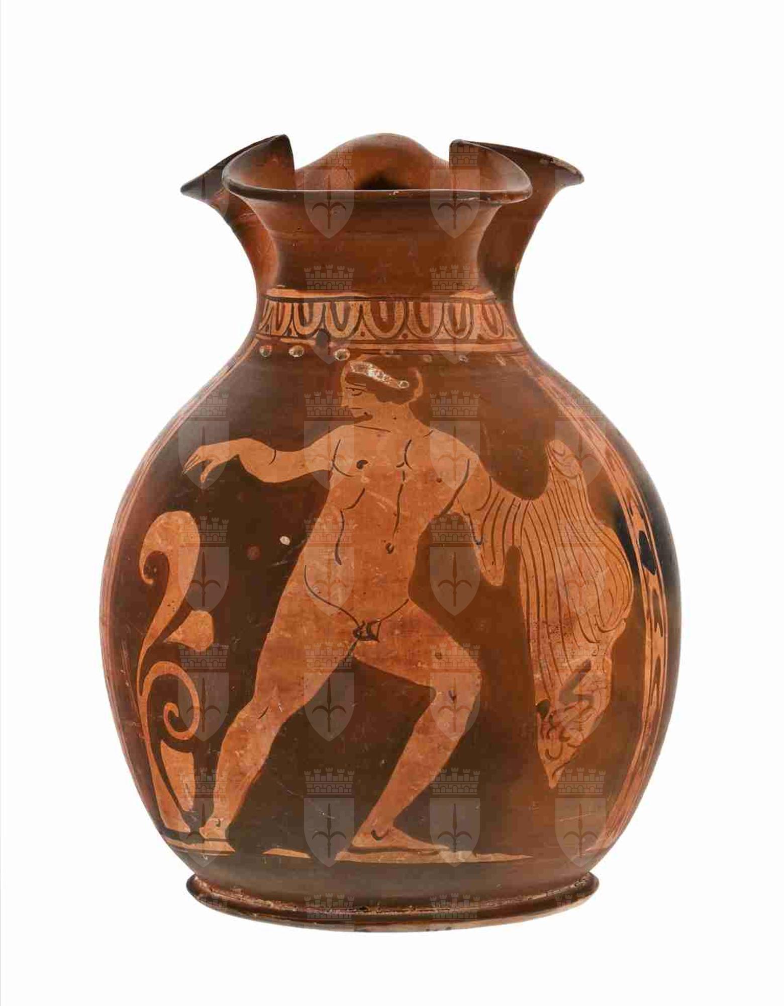 La bocca del vaso è trilobata, con tre lobi ben distinti, l'orlo estroflesso, con labbro arrotondato semplice; Il collo è corto e indistinto e si congiunge ad un corpo globulare, che poggia su un piede ad anello. L'ansa a nastro si imposta verticalmente al di sopra dell'orlo del vaso e sulla parte mediana del corpo. La vernice nera, soprattutto sul retro della brocca, appare fortemente arrossata, probabilmente a causa di problemi di cottura (Munsell 2.5YR 4/6, red); anche l'interno del collo è dipinto. Pochi dettagli sono resi con una sovradipintura bianca. Il colore dell'argilla è oscillante tra Munsell 2.5YR 6/6 (light red) e 2.5YR 5/6 (red). Il motivo principale, racchiuso in una sorta di cornice, presenta un giovane nudo, stante, con il volto di profilo a sinistra, il torso frontale, così come la gamba destra, distesa: il corpo poggia sulla gamba sinistra, piegata, conferendo quindi una posa protesa verso destra. I tratti del volto, così come la muscolatura, sono resi in maniera piuttosto sommaria; sul capo, dai capelli corti e ricciuti, porta una benda o un diadema, sovradipinto in bianco. Il braccio destro è proteso verso sinistra, leggermente flesso e rappresentato di tre quarti, mentre il sinistro è avvolto in un mantello, con molte pieghe riprodotte in maniera molto schematica con una serie di linee parallele. A completare la composizione, a sinistra del giovane nudo, un girale fogliato e fiorito. È presente anche un piano di appoggio delle figure, un terreno brullo. A fare da cornice alla composizione centrale, una striscia ad ovuli intervallati da punti, inquadrata da due filetti a risparmio e, verticalmente, un motivo a V rovesciata, ugualmente limitato da linee nere e fasce a risparmio. Inoltre, sopra la testa della figura, una fila di punti bianchi.