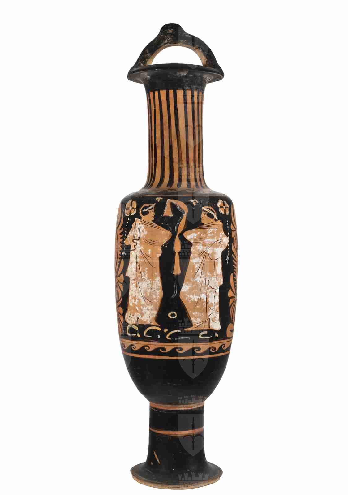 Il vaso presenta un corpo ovoide con pareti cilindriche e spalla pronunciata e segnata da un listello a rilievo; il collo è lungo e dal profilo cilindrico, con imboccatura svasata e orlo estroflesso semplice. Il corpo del vaso poggia su un piede a disco semplice con un alto stelo. L'ansa sopraelevata presenta un foro per la sospensione. La vernice nera è opaca, uniforme e risparmia l'interno della bocca e dell'ansa, nonché due filetti, all'attaccatura del piede e a metà dello stesso; sono inoltre presenti estese sovradipinture in bianco e giallo-bruno, non solo per dettagli, ma anche per campiture più ampie. Il colore dell'argilla oscilla tra Munsell 7.5YR 7/6 (reddish yellow) e 2.5 YR 6/8 (light red). La composizione del lato A presenta tre figure femminili disposte su due piani; la figura in alto è alata, seduta su un elemento del paesaggio indicato solo da lievi tratti sovradipinti in bianco, molto sbiaditi. La fanciulla ha il volto di profilo a sinistra, il torso di tre quarti e le gambe accavallate all'altezza delle tibie; le grandi ali sono spiegate e ricche di dettagli decorativi: una fila di punti bianchi sull'orlo superiore, una prima fila di penne in nero e una se-conda in bianco, resa con una serie di tratti paralleli di lunghezza differente. Porta i capelli, dipinti in bianco e dettagliati in giallo-bruno, così come la pelle, raccolti in uno chignon sulla nuca, con riccioli che ricadono sulle tempie. Il lungo chitone, naturalisticamente drappeggiato, è cinto sotto al costato da una cintura decorata da punti bianchi; bianco-gialli sono anche i piedi, probabilmente a rappresentare delle calzature. La figura in basso a sinistra è in posizione stante, con il volto di profilo a destra; il torso è frontale, la gamba destra portante, la sinistra leggermente flessa. I capelli, neri, sono corti e cinti da un serto, sovradipinto in bianco, con una catenella che sventola dietro la nuca. La figura veste ciò che sembra essere un lungo chitone, con un himation drappeggiato attorno al braccio sinistro. In questo caso la pelle non è bianca, indicando forse una figura maschile; i piedi invece sono dipinti in bianco, probabilmente a segnalare delle calzature. Nella mano destra regge una fronda a forma di spiga, sovradipinta in bianco. A destra troviamo un'altra figura femminile seduta su un elemento del paesaggio appena accennato, analogamente alla figura alata in alto. Il volto è di profilo a sinistra, mentre il torso, di tre quarti, è rivolto verso destra; le gambe, corte rispetto al resto del corpo, sono flesse. I capelli sono anch'essi molto simili a quelli della figura alata, sovradipinti in bianco, dettagliati in giallo-bruno e raccolti in uno chignon. La pelle è completamente campita in bianco e i dettagli anatomici sono quasi del tutto scomparsi. La fanciulla è seminuda, soltanto la metà inferiore del corpo è drappeggiata da un mantello; ai piedi porta dei calzari. Tra le mani regge una tenia, sovradipinta in bianco. La scena è completata da una serie di elementi paesaggistici come la fronda all'estrema sinistra e il ciuffo d'erba tra le due figure in basso, entrambi sovradipinti in bianco. Vi sono inoltre alcuni riempitivi, tre fiori con dettagli in bianco (a sinistra della testa della figura stante, tra le due figure in basso e a destra della testa della fanciulla alata, in questo caso con catenella). Il lato B presenta una scena di dialogo tra due giovani ammantati: le due figure sono quasi speculari, perfetta-mente di profilo, con i capelli corti e cinti da una tenia. Dai mantelli, dalla sovradipintura bianca molto sbiadita, spuntano solo le teste e si può intuire la posizione delle gambe, una portante e l'altra flessa. L'himation della figura a sinistra presenta un orlo bordato di nero. Una serie di rapidi tratti arcuati e di punti in bianco-giallo fa da piano di appoggio alle due figure. Come riempitivo compaiono, sempre specularmente, in alto due fiori con catenella, analoghi a quelli del lato A, altri due fiori molto stilizzati e, al centro, una tenia, con un orlo bianco molto sbiadito; sempre al centro, in basso, un cerchio. I motivi accessori includono, sul collo, una serie di linguette verticali nere ad imitazione di una baccellatura e, sul-la spalla, un fregio a onde marine destrorse tra due filetti risparmiati. Sotto alla decorazione principale, un analo-go motivo a onde marine tra due filetti risparmiati. I lati del vaso presentano un intricato motivo a girali (quattro, in una fila verticale al centro), foglie e palmette ai lati. Si è conservata sul collo l'etichetta recante la data di acquisizione da parte del museo: «16 febbraio 1904». L'attuale numero di inventario generale è scritto sotto al piede.