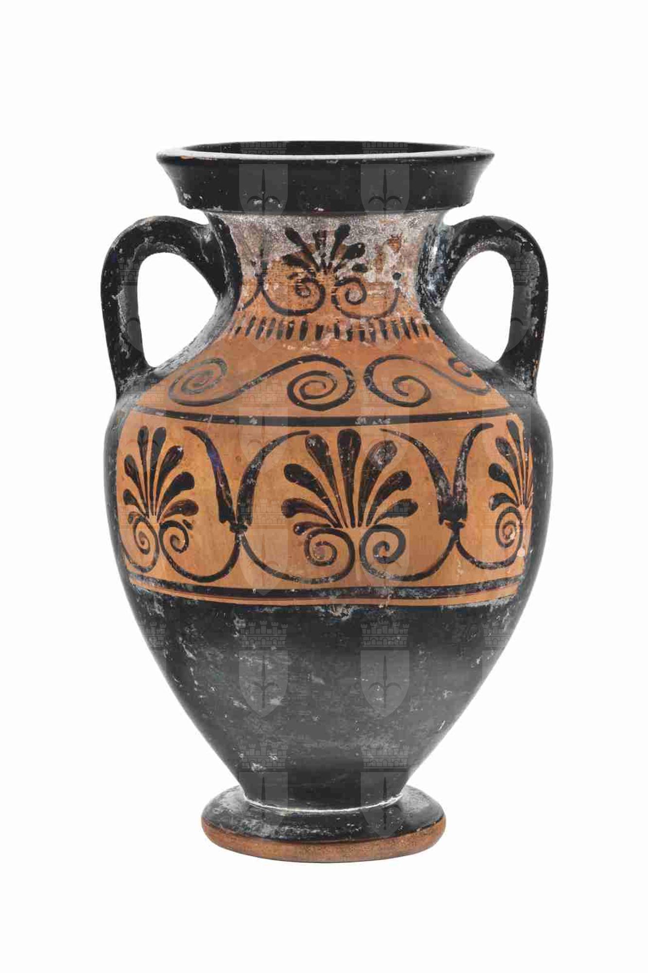 La forma dell'anfora è affine a quella delle anfore campaniformi attiche di tipo B; l'orlo è svasato e modanato, e si attesta su un corto collo cilindrico, dal profilo convesso. Le anse a bastoncello si impostano verticalmente tra il collo e la spalla, poco rilevata, e il corpo ovoide, molto rastremato verso il fondo, poggia su un piede ad echino rovesciato semplice. La vernice nera, piuttosto lucida, è uniforme e copre tutta la superficie del vaso, compreso l'interno del collo, fatta eccezione per i due spazi decorati e una fascia risparmiata alla base del piede; alcuni dettagli della decorazione secondaria presentano inoltre sovradipinture rosse. Il colore dell'argilla è Munsell 7.5YR 5/4 (brown). La decorazione principale del lato A presenta, in un riquadro, limitato in alto da una linea nera, un bovino, fermo e perfettamente di profilo, ma con le gambe in posizione sfalsata, tutte perfettamente visibili; le corna sono a mezzaluna, mentre la lunga coda è biforcuta. Sono rappresentati anche i dettagli della muscolatura, del costato e dei genitali. A destra della scena troviamo un louterion, con una presa centrale in alto e l'orlo decorato, e un ramo d'ulivo, che spunta la bordo destro del riquadro; una linea nera fa da appoggio al motivo figurato. Il lato B presenta un semplice fregio vegetale limitato da due linee nere, composto da tre palmette, una delle quali sborda dal riquadro risparmiato, intervallate da coppie di boccioli di loto; dai boccioli si dipartono due tralci a spirale, che si incontrano alla base delle palmette andando a costituire delle volute. La decorazione accessoria su spalla e collo è pressoché simmetrica sui due lati del vaso, con un motivo a doppia spirale contrapposta sulla spalla, arricchito da un punto rosso al centro delle spirali (meno accurato sul lato B, poiché una della spirali sborda dal riquadro riservato alla decorazione), limitato alla base del collo da una sequenza di linguette nere. Sul collo troviamo nuovamente il motivo a palmette e boccioli di loto, analogo a quello presente sul riquadro del lato B, con una palmetta centrale con volute affiancata dai boccioli. Sull'orlo, sul lato A, è presente una vecchia etichetta, recante un precedente numero di inventario ('852').
