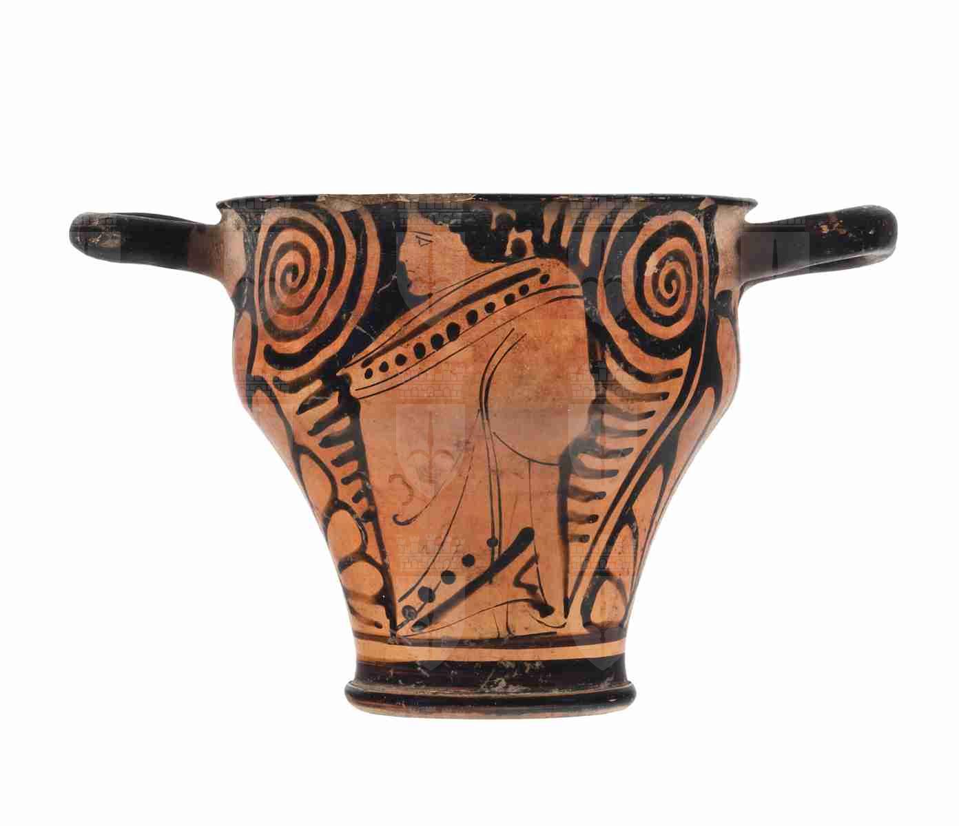 Lo skyphos presenta un corpo situliforme, con un accenno di orlo estroflesso e piede a disco semplice. Le anse a nastro si impostano orizzontalmente poco sotto l'orlo. La vernice nera, tendenzialmente opaca, è uniforme e copre interamente la vasca del vaso, il piede e le anse, risparmiandone però la base e il retro. Il colore dell'argilla varia da Munsell 7.5YR 7/6 (reddish yellow) a 2.5YR 4/6 (red). I due lati presentano una decorazione analoga e quasi simmetrica, con la tozza figura di un giovane ammantato, leggermente più accurata sul lato A. il giovane è perfettamente di profilo a sinistra, con i capelli ricciuti che rica-dono sulla nuca. L'himation copre completamente le forme del corpo e presenta gli orli superiore e inferiore decorati da una fascia nera e una fila di punti; sul lato A il drappeggio del mantello è più accurato e la decorazione più ricca. La decorazione accessoria è composta da palmette sotto le anse, affiancate da coppie di elementi vegetali a foglia con estremità a spirale, estesi fino a fare da sfondo alle figure ammantate. Sotto al piede è presente una decorazione composta da tre cerchi concentrici in nero. Sotto il piede si conserva una vecchia etichetta, recante un precedente numero di inventario ('550') ed è scritto l'attuale numero di inventario generale. Sul lato B, sulla figura, si intravede una scritta, quasi illeggibile ('347').